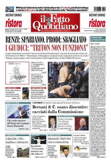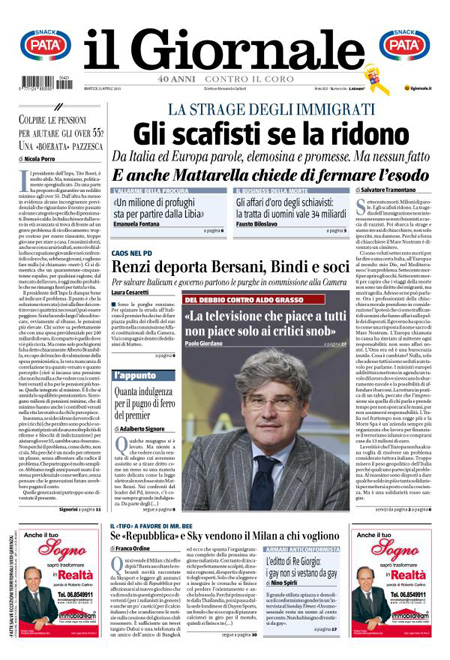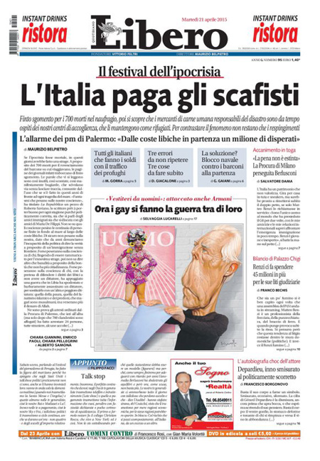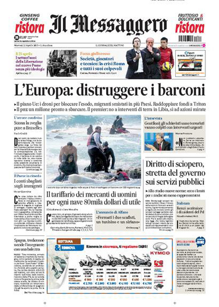 Il Sole 24 Ore: “Fisco, così l’abuso del diritto”. Il Messaggero: “L’Europa: distruggere i barconi”. Il Giornale: “Gli scafisti se la ridono”. Libero: “L’Italia paga gli scafisti”.