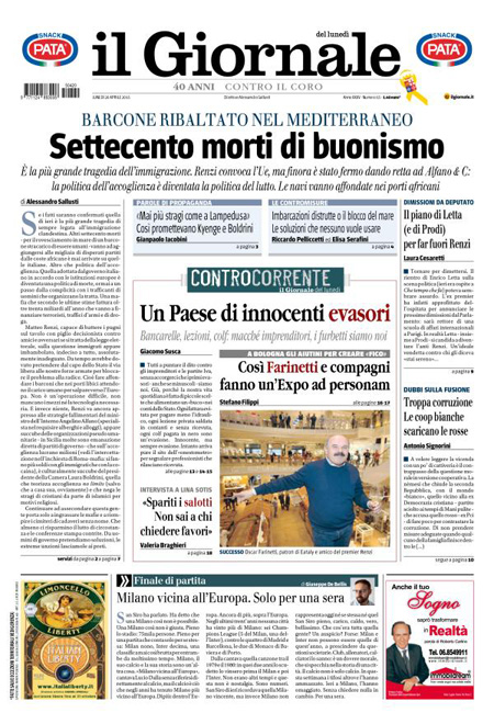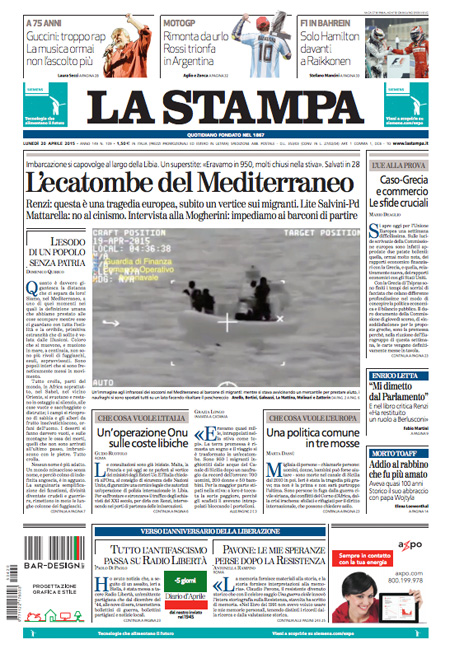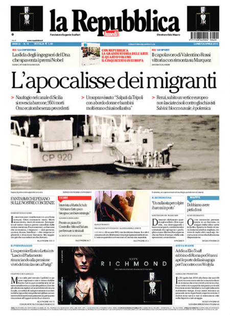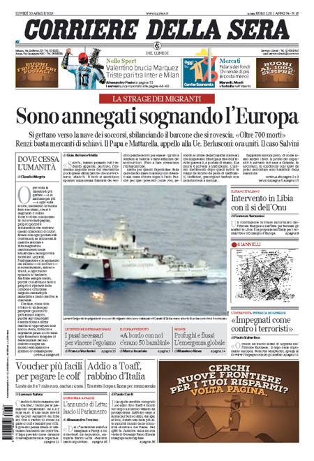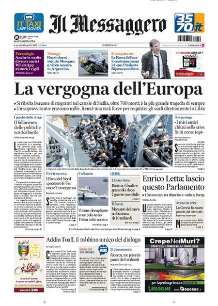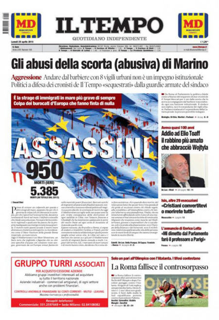 La Repubblica: “L’apocalisse dei migranti”. Il Messaggero: “La vergogna dell’Europa”. Il Giornale: “Settecento morti di buonismo”. Il Tempo: “Gli abusi della scorta (abusiva) di Marino”.