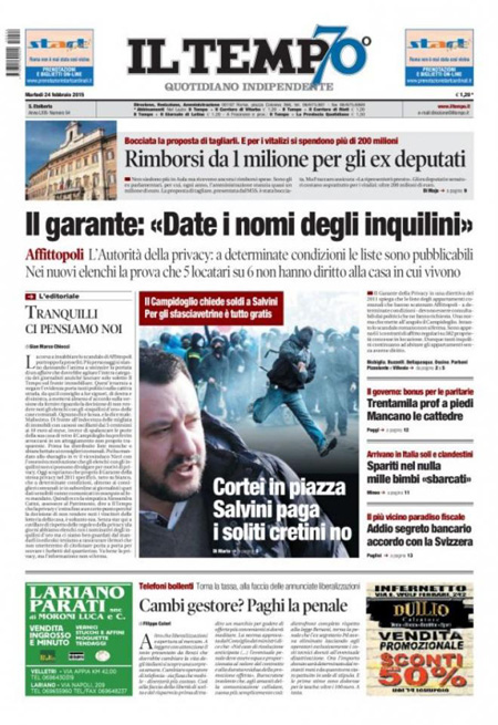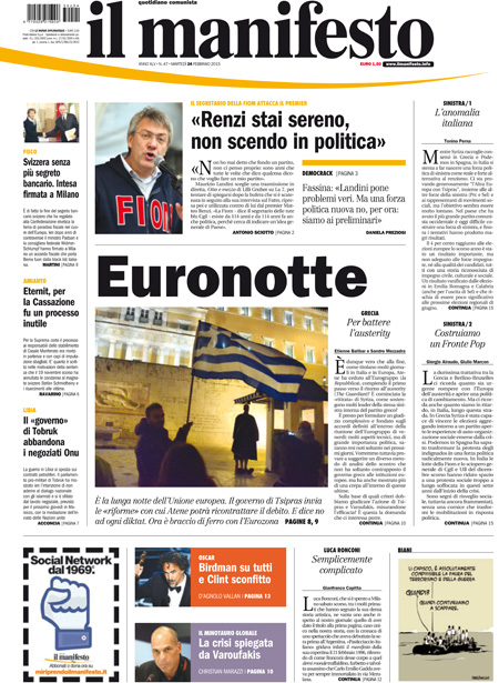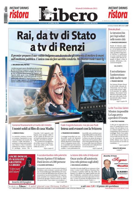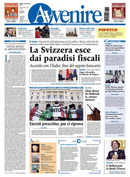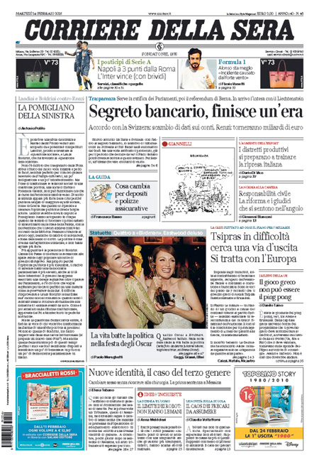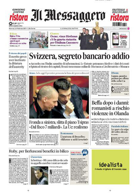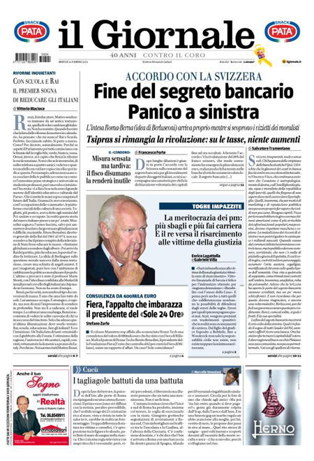 Il Messaggero: “Svizzera, segreto bancario addio”. Il Giornale: “Fine del segreto bancario. Panico a sinistra”. Il Manifesto: “Euronotte”. Il Fatto Quotidiano: “Condannati al vitalizio”. Libero: “Rai, da tv di Stato a tv di Renzi”.