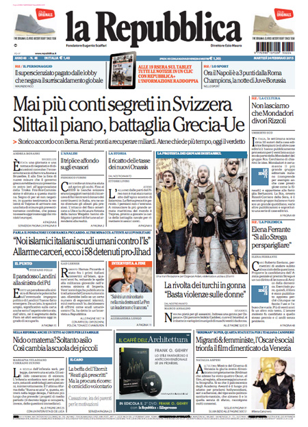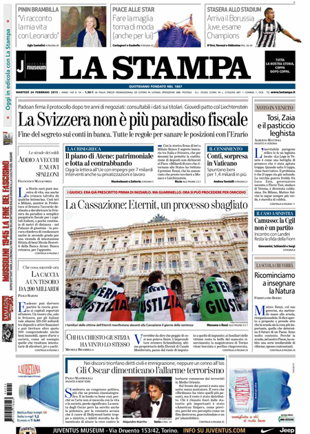 ROMA – Le prime pagine dei giornali di martedì 24 febbraio. La Stampa: “La Svizzera non è più paradiso fiscale”. Il Corriere della Sera: “Segreto bancario, finisce un’era”. La Repubblica: “Mai più conti segreti in Svizzera. Slitta il piano, battaglia Grecia-Ue”. Il Sole 24 Ore: “Italia e Svizzera firmano l’addio al segreto bancario”.