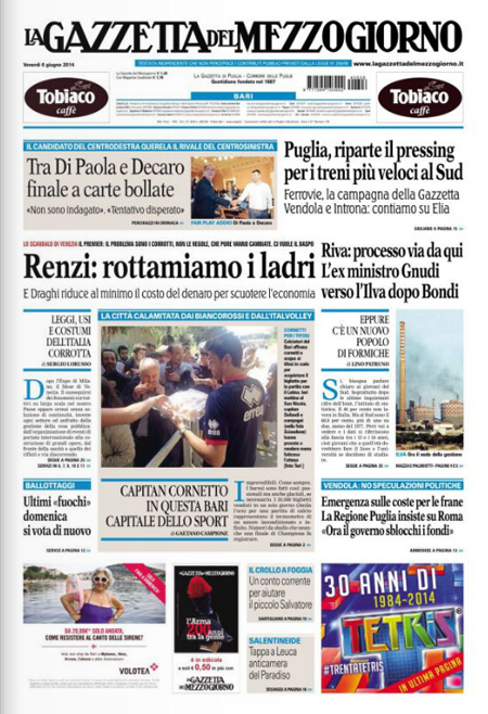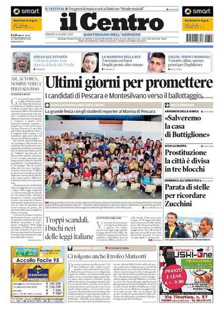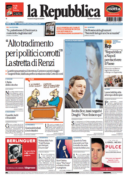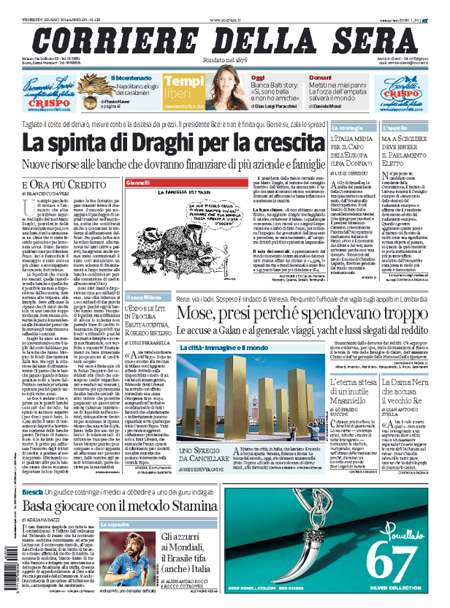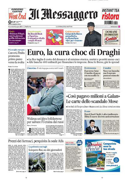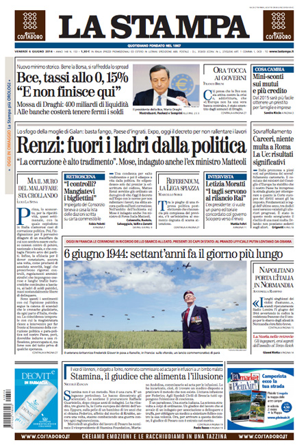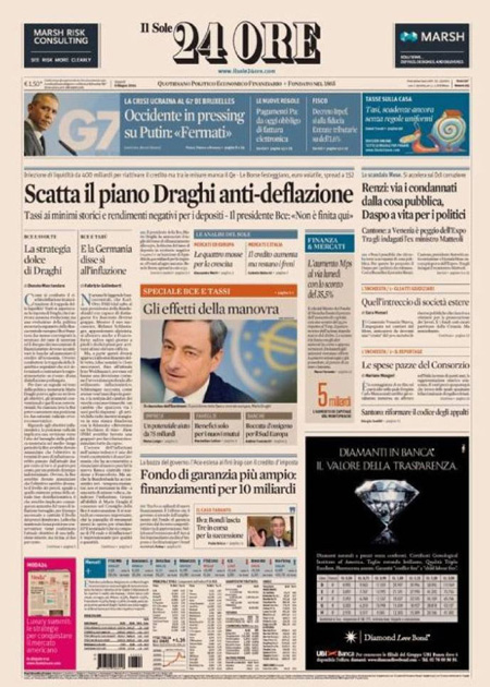 ROMA – Sono due le notizie che si dividono le aperture dei quotidiani in edicola venerdì 6 giugno: la prima è la decisione della Banca Centrale Europea di tagliare i tassi per rilanciare il credito e favorire la ripresa economica in Europa, decisione apprezzata dalle borse europee che hanno chiuso tutte al rialzo ieri.