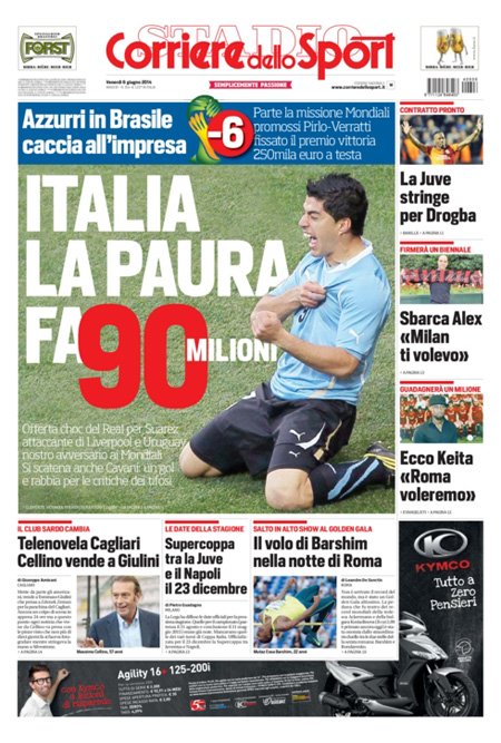 I quotidiani sportivi si dividono tra notizie di calciomercato (Real su Suarez: 90 mln di euro offerti al Liverpool) e sulla Nazionale italiana partita ieri per il Brasile.