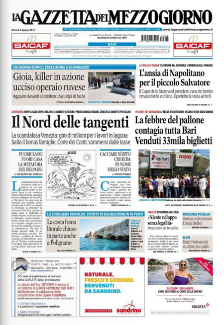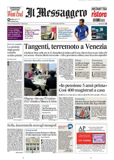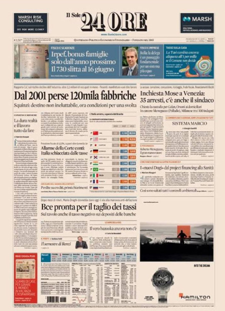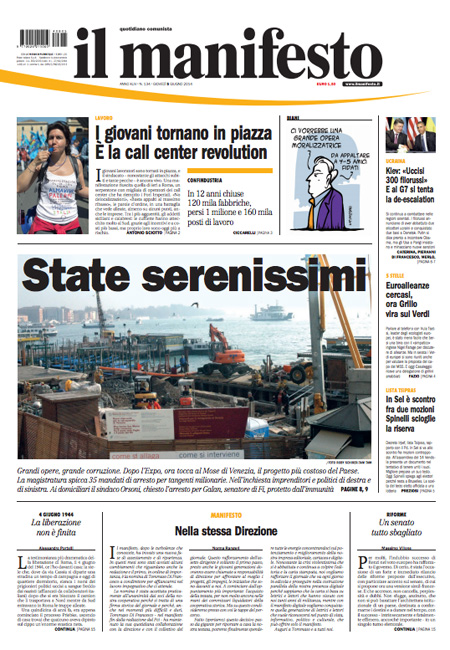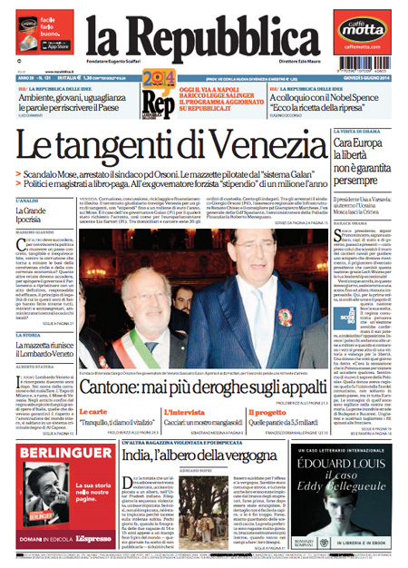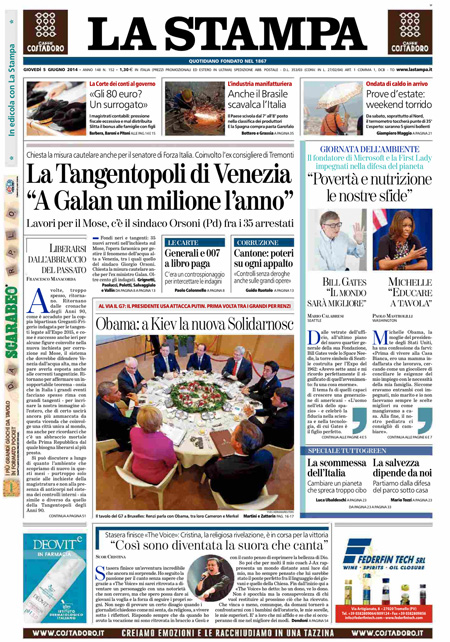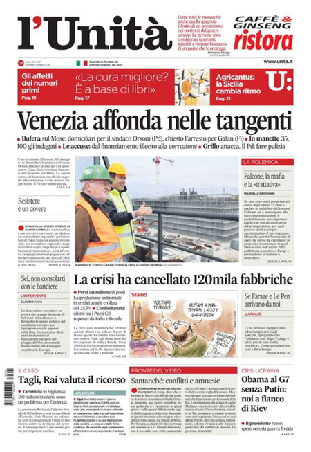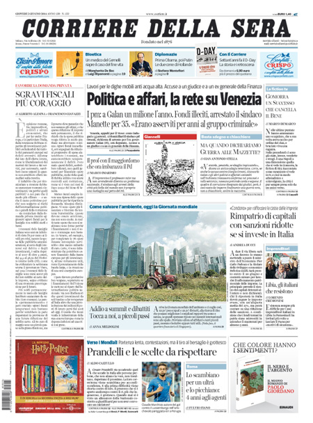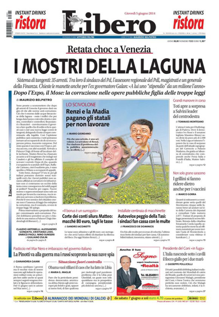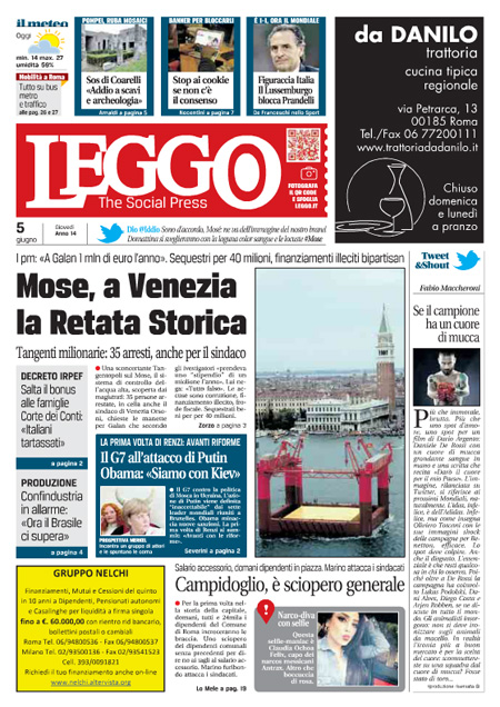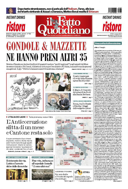 ROMA – I quotidiani di oggi, giovedì 5 giugno, aprono con gli arresti decisi dalla procura di Venezia nell’indagine per la presunta corruzione legata alla costruzione del Mose, il sistema di paratoie che dovrebbe proteggere la laguna di Venezia dall’acqua alta.