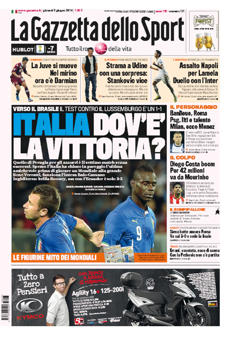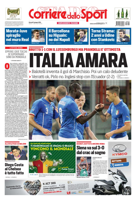 I quotidiani sportivi mettono in risalto il deludente pareggio della Nazionale azzurra nell’amichevole contro il Lussemburgo.