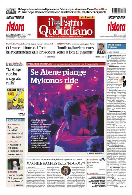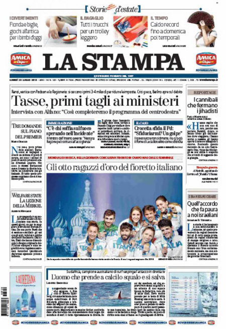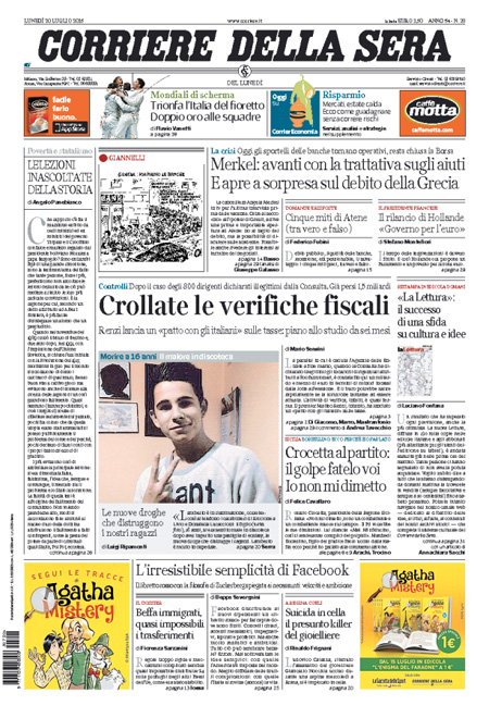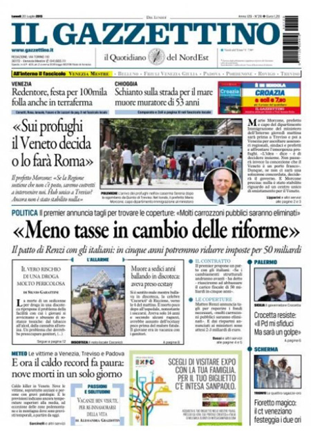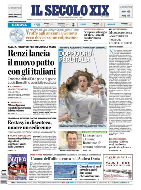 ROMA – Sulle prime pagine dei giornali di oggi, lunedì 20 luglio, si parla ancora delle dichiarazioni di Matteo Renzi sui futuri abbassamenti delle tasse e dei probabili tagli alla spesa che questi comporteranno. Si parla anche del caso Crocetta, dopo che diversi esponenti del Partito Democratico hanno chiesto le dimissioni del presidente della Sicilia e il ricorso a elezioni anticipate.