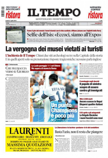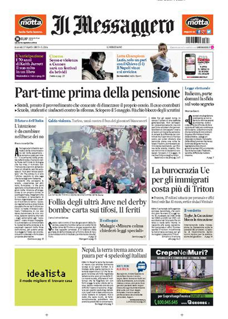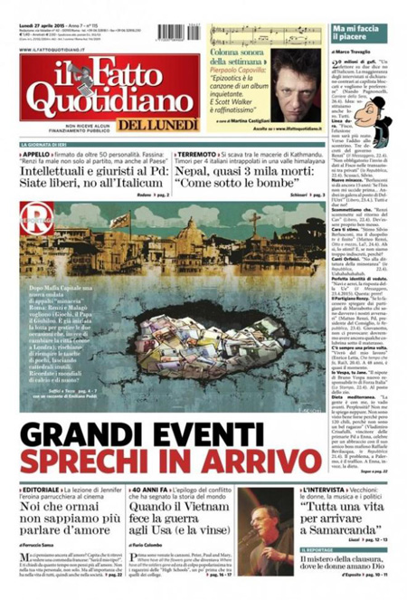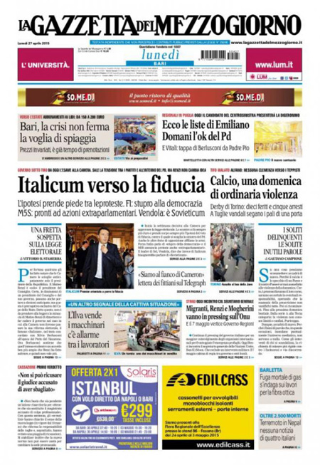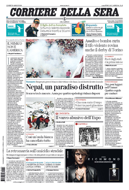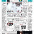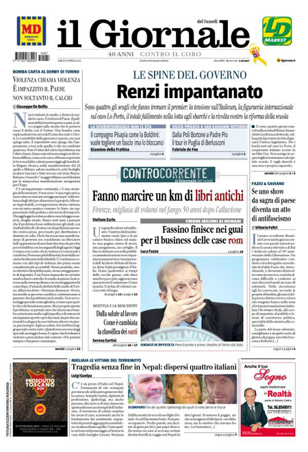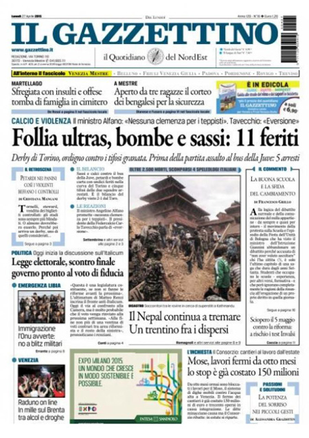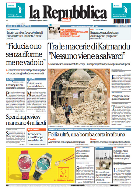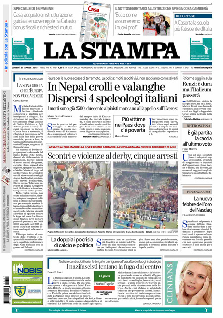 ROMA – Le notizie principali che si dividono nelle aperture dei giornali di oggi, 27 aprile, sono la nuova scossa di terremoto in Nepal con l’aggiornamento del numero dei morti, che sarebbero più di duemila, e la presenza di quattro italiani fra i dispersi, gli scontri fra i tifosi durante il derby di Torino, e l’esame che inizia oggi da parte della Camera della riforma elettorale, sulla quale il governo sembra orientato a chiedere la fiducia.