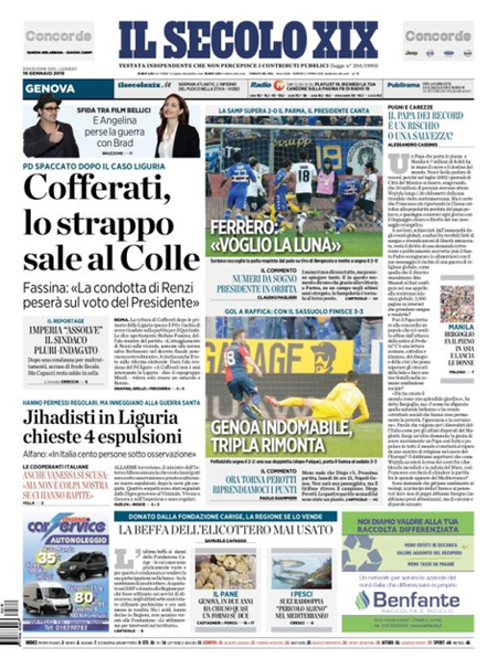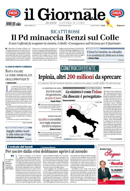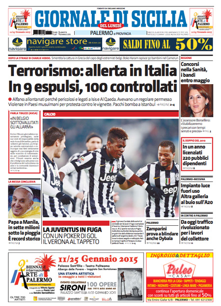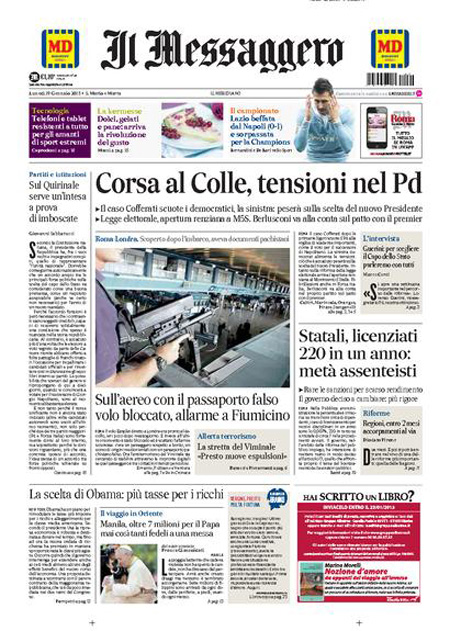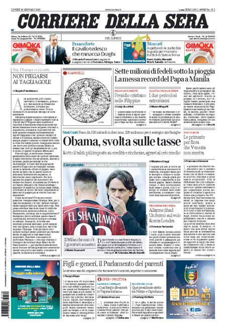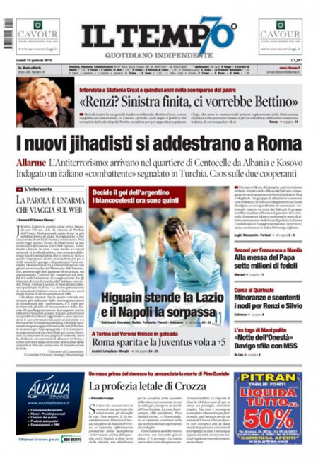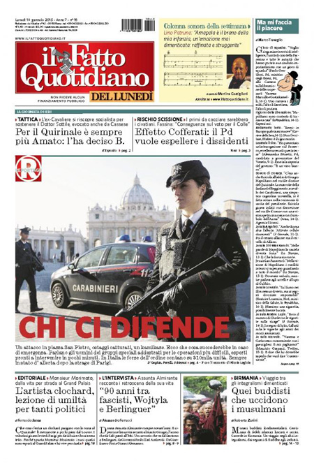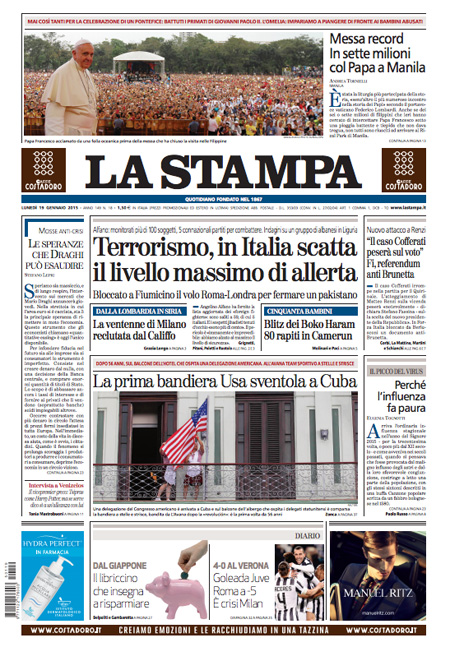 ROMA – Le prime pagine dei giornali di lunedì 19 gennaio. La Stampa: “Terrorismo, in Italia scatta il livello massimo di allerta”. Il Corriere della Sera: “Obama, svolta sulle tasse”. La Repubblica: “Quirinale, il caso Cofferati divide il Pd”. Il Messaggero: “Corsa al Colle, tensioni nel Pd”. Il Giornale: “Il Pd minaccia Renzi sul Colle”. Il Tempo: “I nuovi jihadisti si addestrano a Roma”.