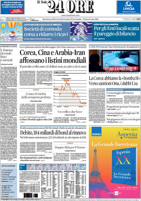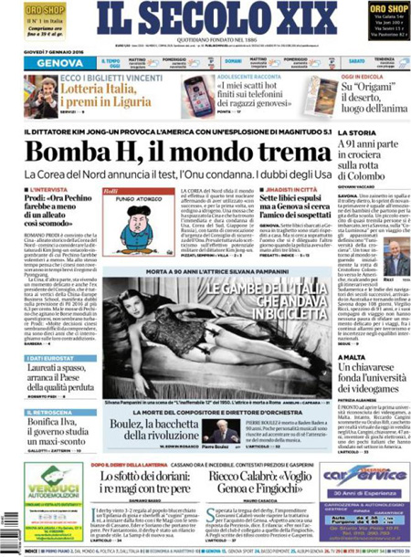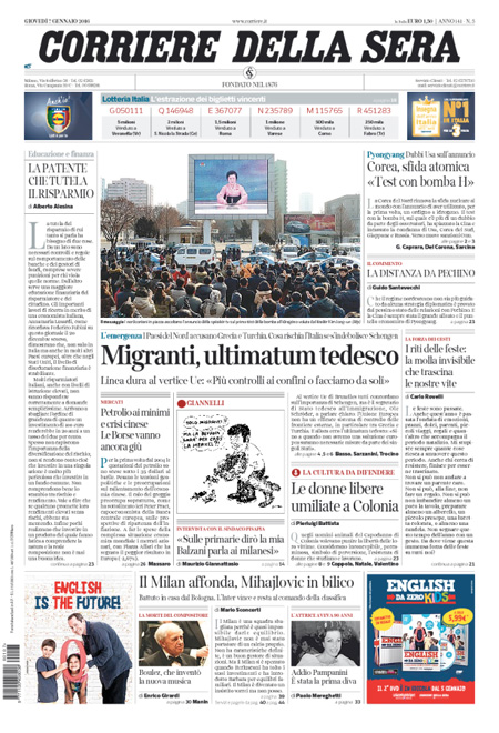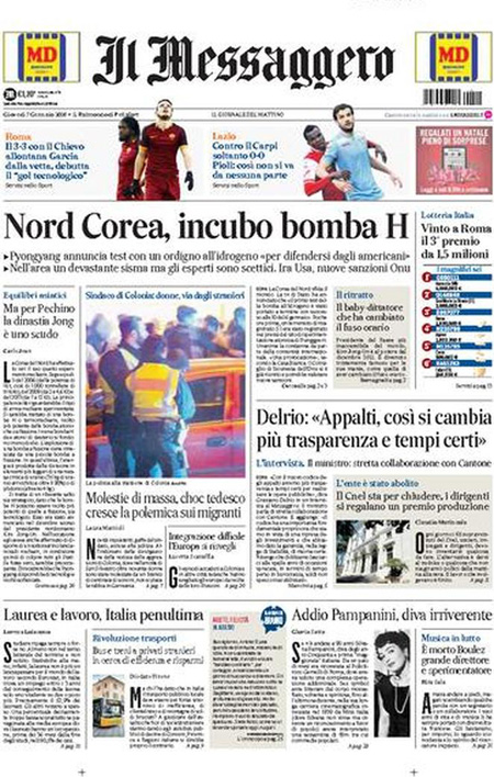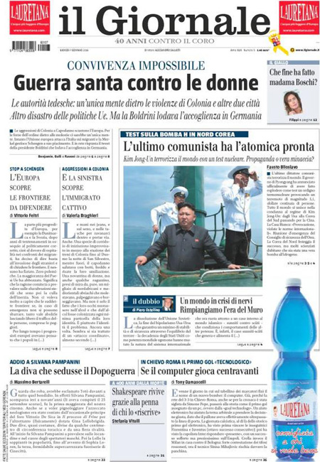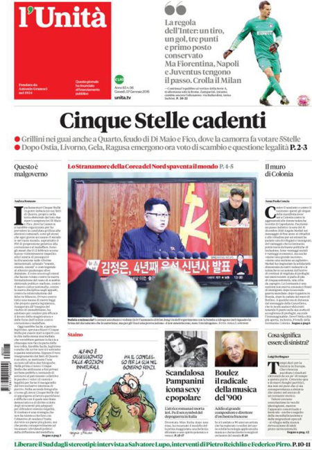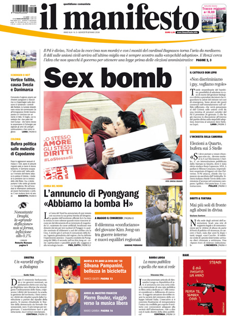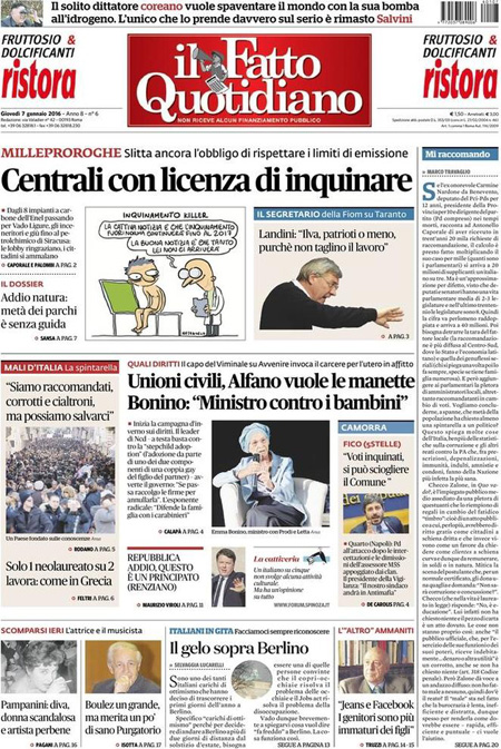 ROMA – Quasi tutti i giornali di oggi, 7 gennaio, aprono sul test nucleare annunciato ieri mattina dal governo della Corea del Nord, sulla condanna dell’ONU e sui dubbi degli Stati Uniti sulla tecnologia usata. Il Giornale invece, titola sulle violenze di Colonia contro le donne, mentre il Manifesto e il Fatto Quotidiano si occupano del cammino parlamentare della legge sulle unioni civili.