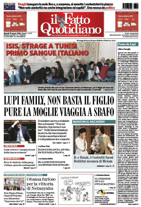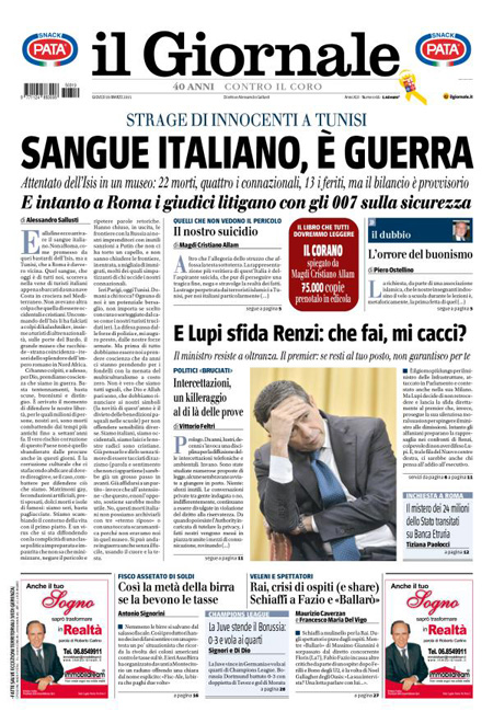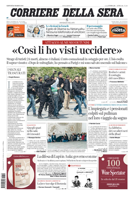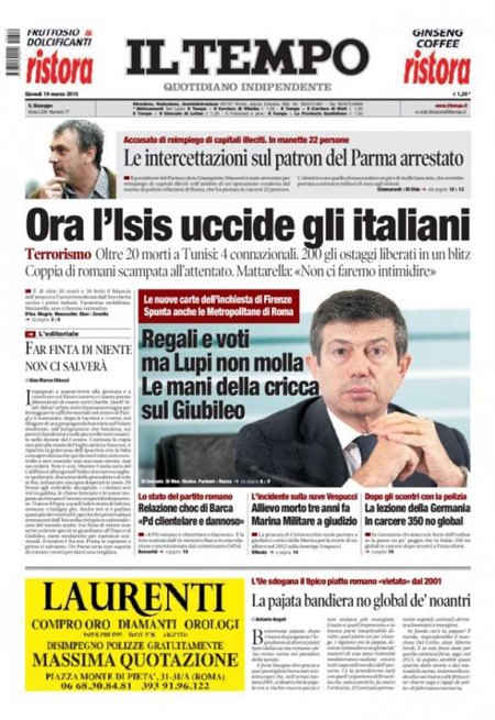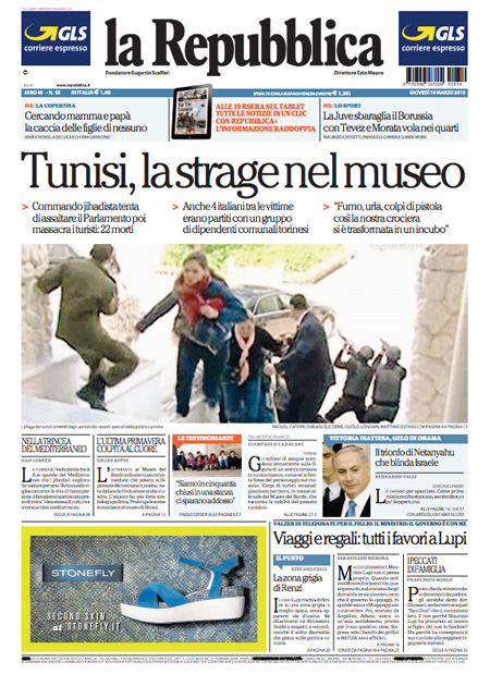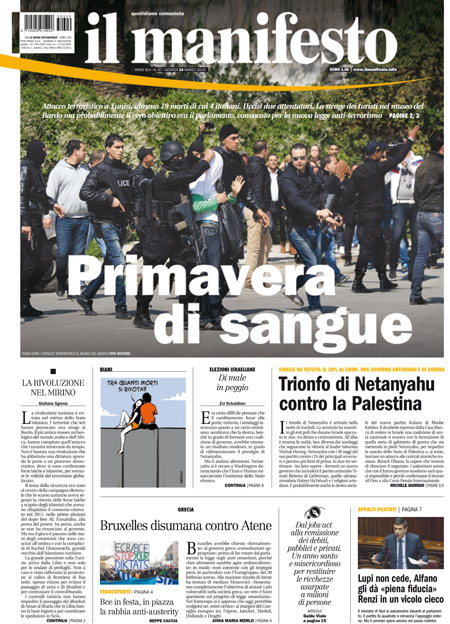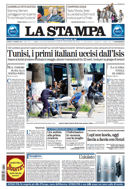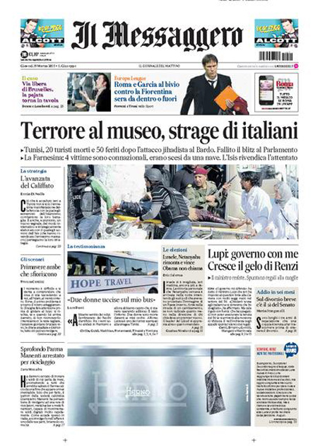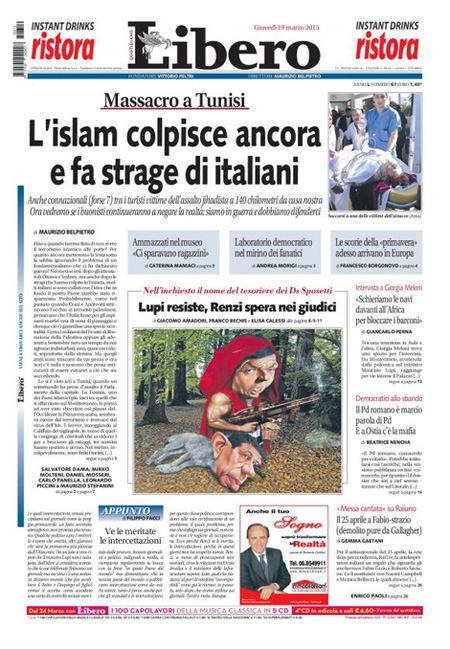 Il Messaggero: “Terrore al museo, strage di italiani”. Il Giornale: “Sangue italiano, è guerra”. Il Manifesto: “Primavera di sangue”. Libero: “L’Islam colpisce ancora e fa strage di italiani”. Il Tempo: “Ora l’Isis uccide gli italiani”.