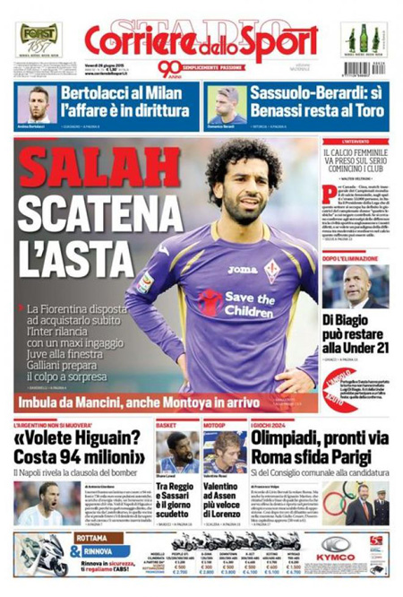 Sui giornali sportivi si parla delle offerte di acquisto per Pogba, l’asta tra Inter e Fiorentina per ingaggiare Salah e il primo acquisto importante del Milan.