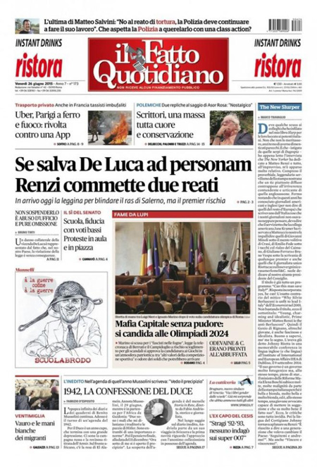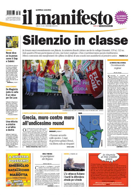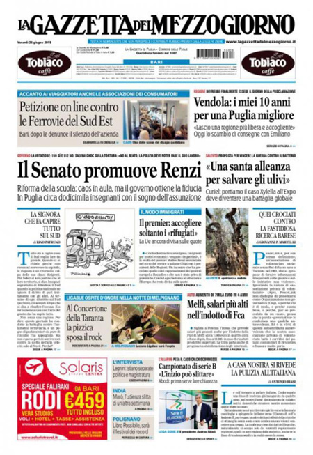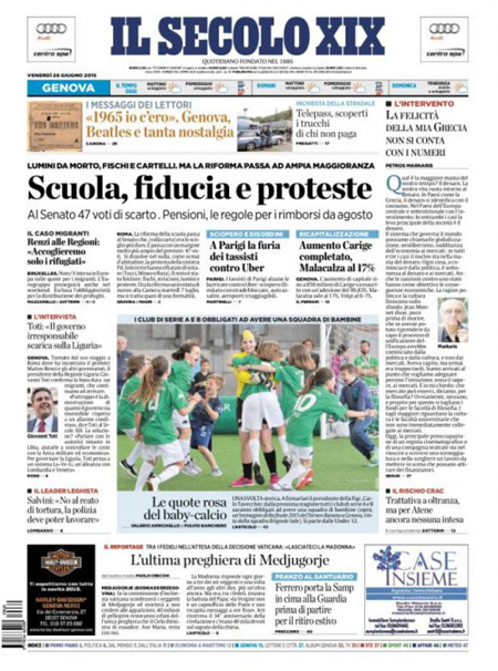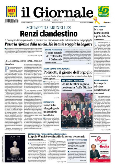 Le altre tre notizie con cui aprono i giornali sono l’approvazione della riforma della scuola in Senato, le trattative per i nuovi prestiti alla Grecia e infine il dibattito europeo sulla gestione dei profughi e degli immigrati: l’Italia insiste per una ripartizione tra tutti gli stati UE, ma molti sono contrari.