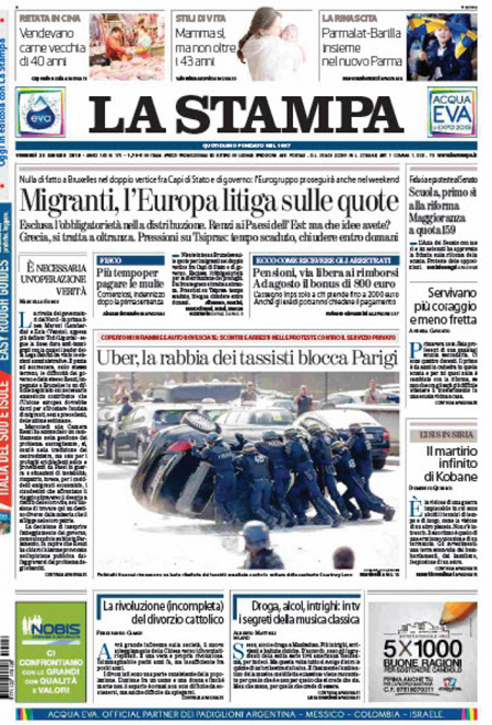ROMA – Sulle prime pagine dei giornali di oggi, 26 giugno, ci sono le foto delle proteste e dei disordini di ieri durante la manifestazione dei tassisti francesi contro Uber a Parigi: traffico bloccato, copertoni incendiati e auto rovesciate.