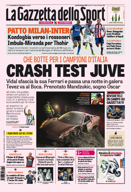 Sui giornali sportivi si parla molto dell’incidente d’auto in Cile del calciatore della Juventus Arturo Vidal e del suo arresto per guida in stato di ebbrezza.