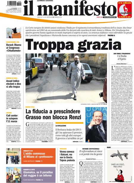 Il Corriere della Sera apre invece sulle missioni contro l’ISIS in Libia, la Stampa si occupa del rapporto della Commissione Europea sullo stato delle banche italiane, e il Manifesto della condanna dell’Italia da parte della Corte Europea dei diritti umani per il rapimento dell’imam Abu Omar, mentre i giornali sportivi titolano sul pareggio in rimonta della Juventus contro il Bayern Monaco nell’andata degli ottavi di finale di Champions League.