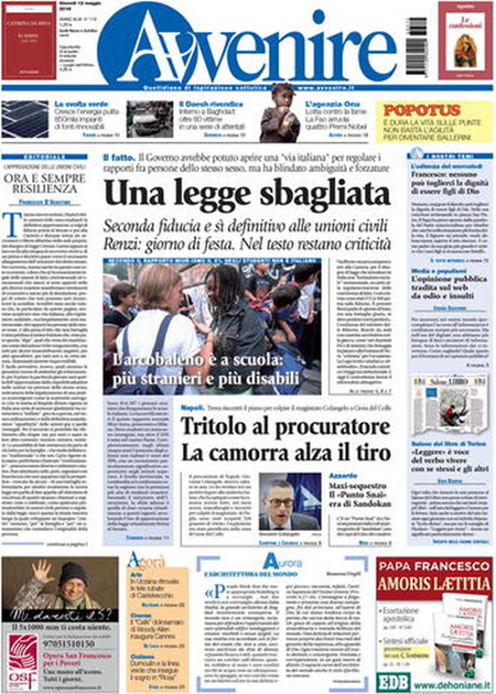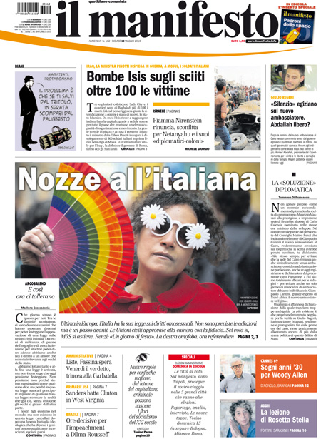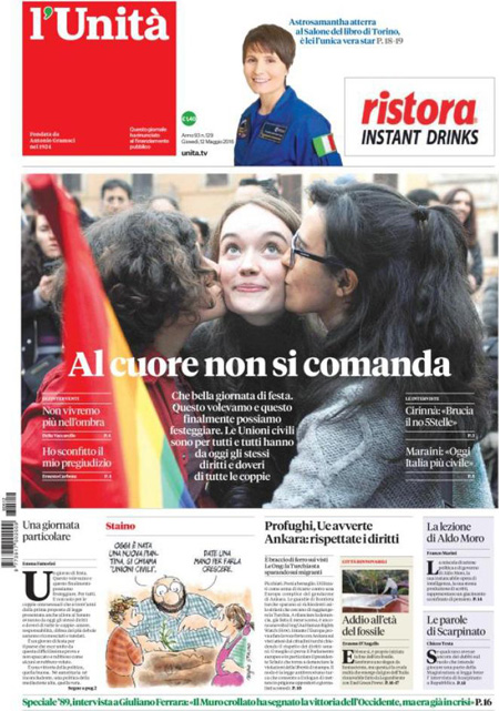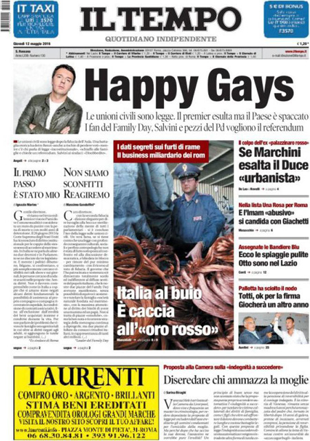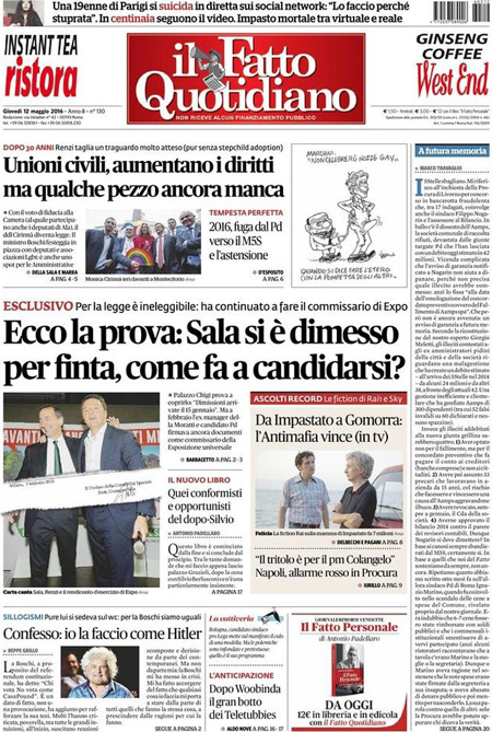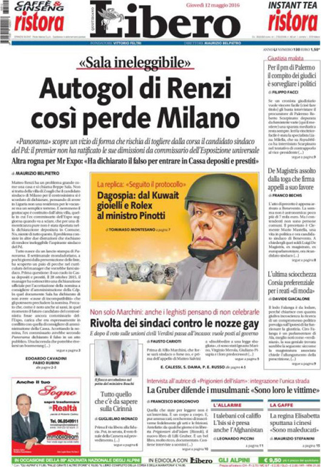 La prima pagina del Messaggero: “Unioni civili, ecco i nuovi diritti”. La prima pagina di Libero: “Autogol di Renzi, cosรฌ perde Milano”. La prima pagina del Fatto Quotidiano: “Ecco la prova: Sala si รจ dimesso per finta, come fa a candidarsi?”. La prima pagina del Tempo: “Happy gays”.ย Queste le prime pagine dei giornali di giovedรฌ 12 maggio.