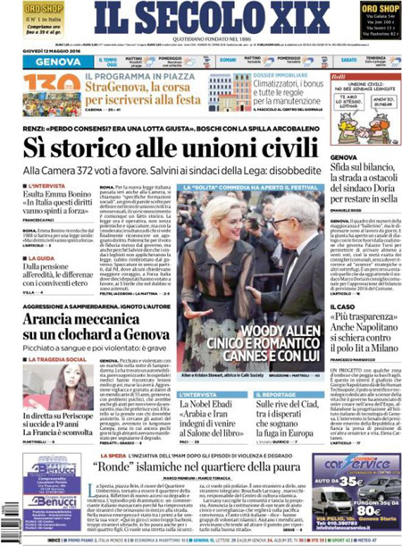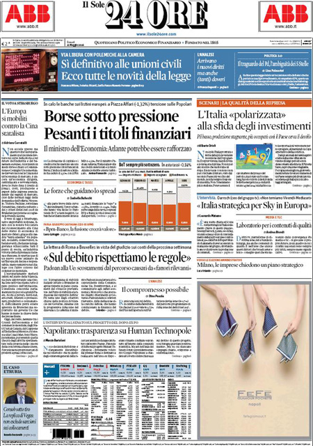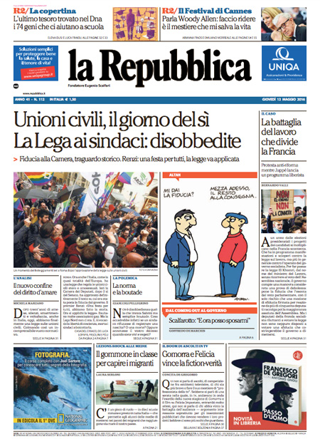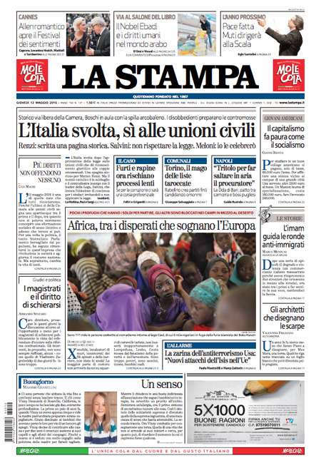 ROMA – Queste le prime pagine dei giornali di giovedรฌ 12 maggio. La prima pagina de La Stampa: “L’Italia svolta, sรฌ alle unioni civili”. La prima pagina del Corriere della Sera: “Unioni civili, ecco che cosa cambia”. La prima pagina de La Repubblica: “Unioni civili, il giorno del sรฌ. La Lega ai sindaci: disobbedite”. La prima pagina del Sole 24 Ore: “Borse sotto pressione. Pesanti i titoli finanziari”.