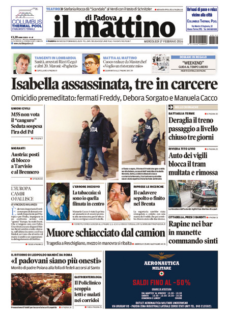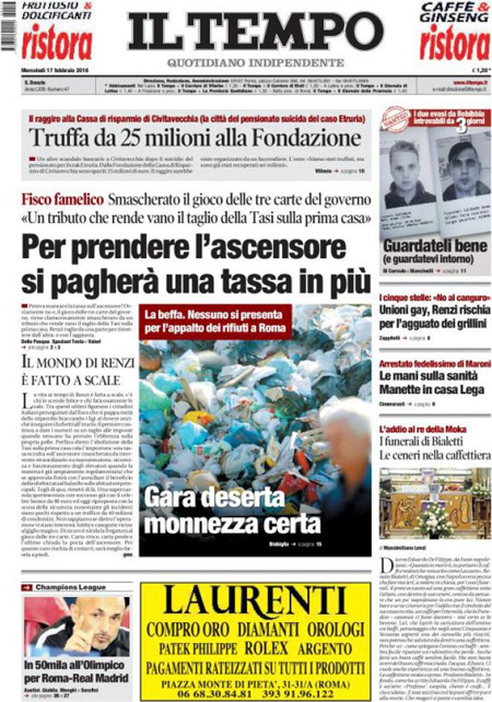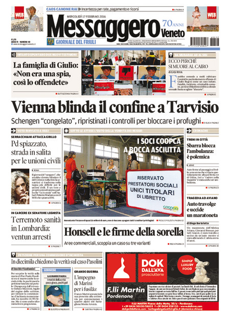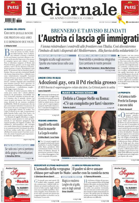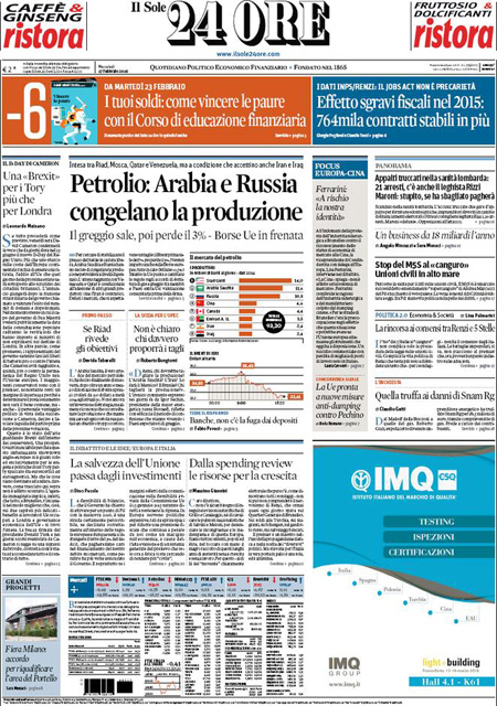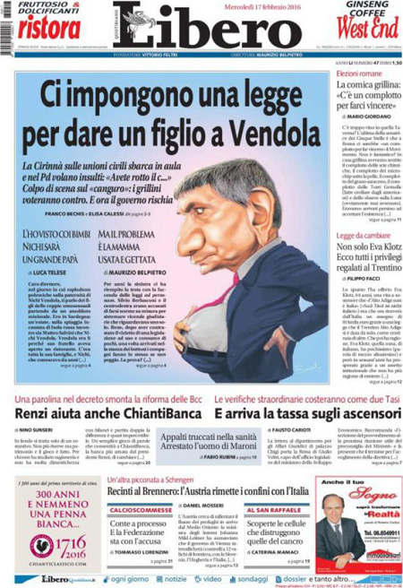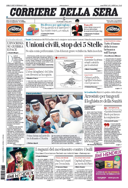 La prima pagina del Sole 24 Ore: “Petrolio: Arabia e Russia congelano la produzione. Il greggio sale, poi perde il 3%. Borse Ue in frenata”. La prima pagina del Messaggero: “No M5S, unioni civili a rischio. A sorpresa i Cinquestelle non votano il super emendamento, seduta rinviata a oggi. L’ira di Renzi: manovra sulla pelle dei diritti. Piรน vicino il voto libero sulle adozioni”. La prima pagina del Giornale: “L’Austria ci lascia gli immigrati. Vienna reintroduce i controlli alle frontiere con l’Italia”. La prima pagina di Libero: “Ci impongono una legge per dare un figlio a Vendola”. La prima pagina del Fatto Quotidiano: “Rubano pure sulle dentiere”. Queste le prime pagine dei giornali di mercoledรฌ 17 febbraio.