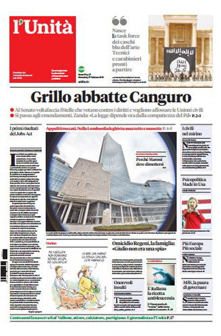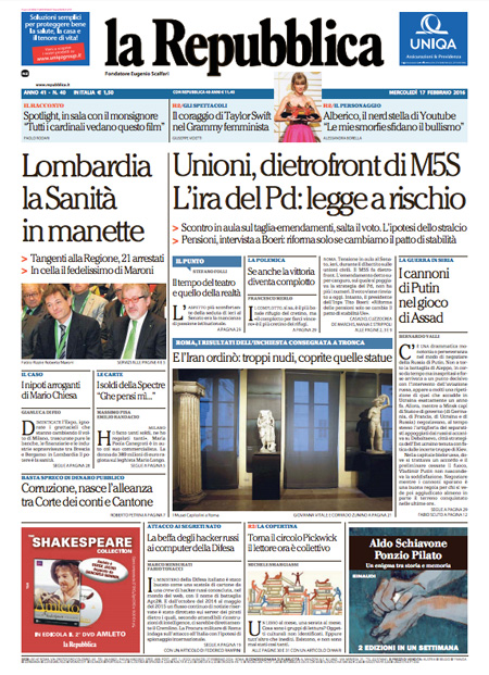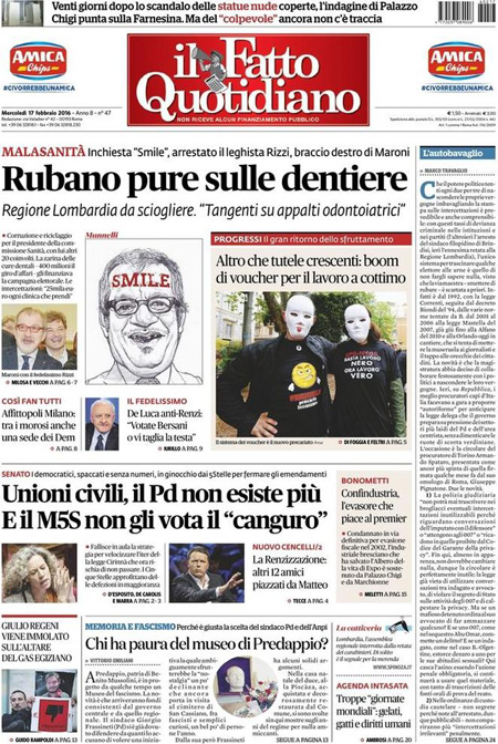 ROMA – Queste le prime pagine dei giornali di mercoledรฌ 17 febbraio. La prima pagina de La Stampa: “Unioni civili, lo sgambetto di Grillo. L’ira di Renzi: un voltafaccia elettorale. Appalti truccati nelle cure ospedaliere della Lombardia, in cella il braccio destro di Maroni”. La prima pagina del Corriere della Sera: “Unioni civili, stop dei 5 Stelle. No alla corsia preferenziale. L’ira di Renzi: voltafaccia. Salta la seduta”. La prima pagina de La Repubblica: “Unioni, dietrofront di M5S. L’ira del Pd: legge a rischio. Scontro in aula sul taglia-emendamenti, salta il voto. L’ipotesi dello stralcio”.