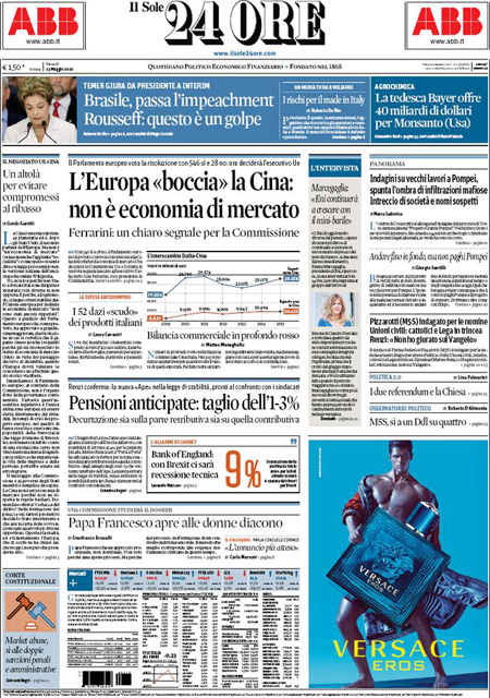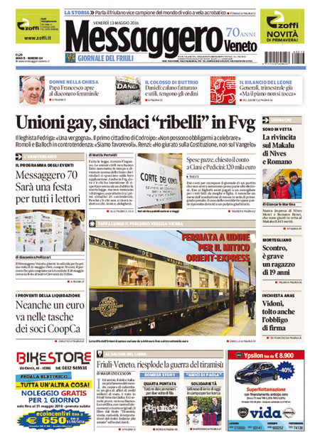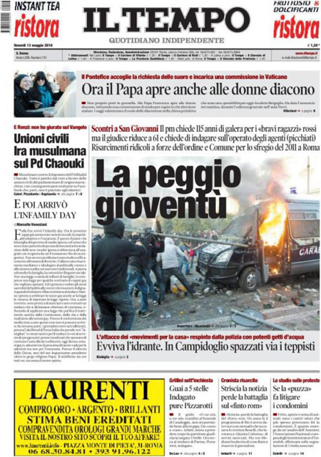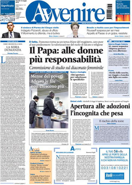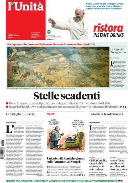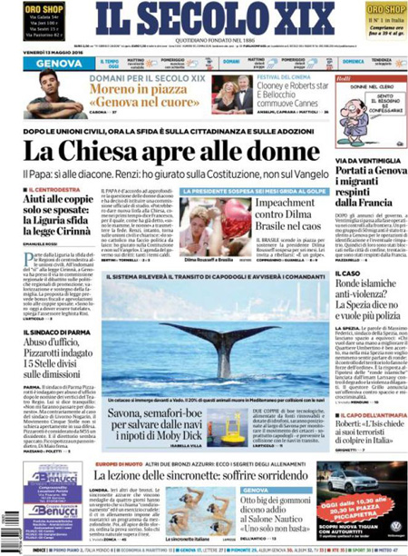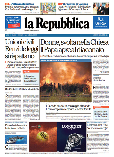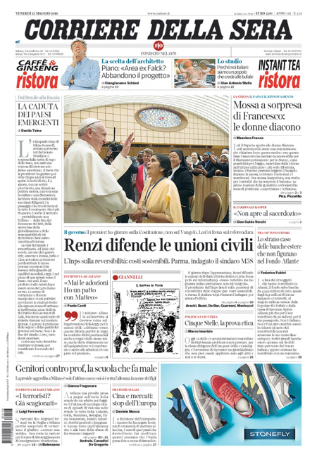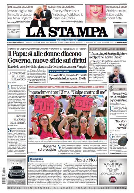 ROMA – Queste le prime pagine dei giornali di venerdรฌ 13 maggio. La prima pagina de La Stampa: “Il Papa: sรฌ alle donne diacono. Governo, nuove sfide sui diritti”. La prima pagina del Corriere della Sera: “Renzi difende le unioni civili”. La prima pagina de La Repubblica: “Donne, svolta nella Chiesa. Il Papa apre al diaconato”. La prima pagina del Sole 24 Ore: “L’Europa boccia la Cina, non รจ economia di mercato”.