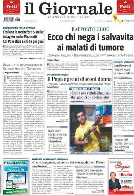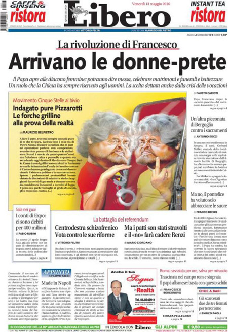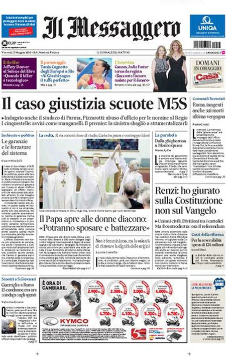 La prima pagina del Messaggero: “Il caso giustizia scuote il M5s”. La prima pagina di Libero: “Arrivano le donne-prete”. La prima pagina del Giornale: “Ecco chi nega i salvavita ai malti di tumore”.ย Queste le prime pagine dei giornali di venerdรฌ 13 maggio.