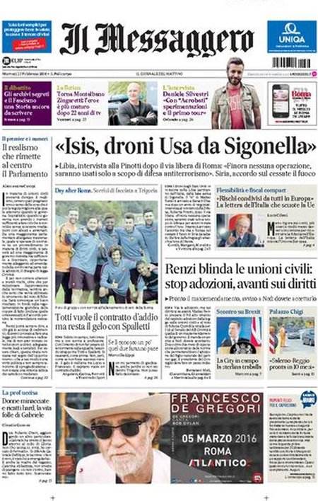 Altri quotidiani si occupano della conferenza stampa del Presidente del Consiglio Renzi con i giornalisti della stampa estera per i due anni di governo, mentre il Messaggero titola sulla decisione di autorizzare i droni americani in missione contro l’ISIS in Libia a decollare dall’aeroporto di Sigonella, e la Stampa anticipa i contenuti del rapporto della Commissione UE sull’economia dell’Italia.
