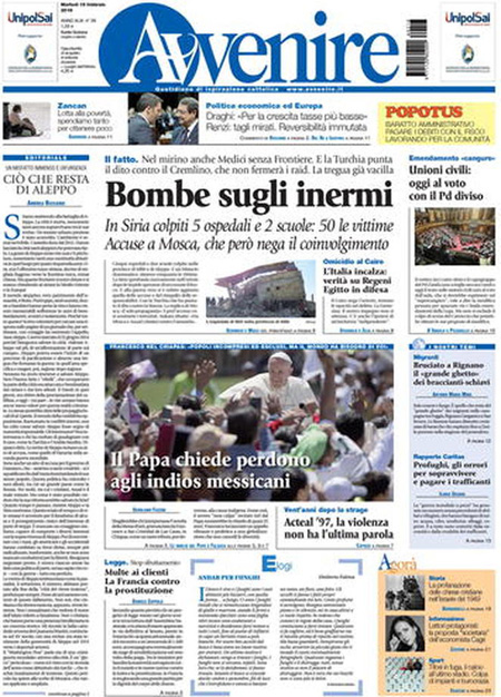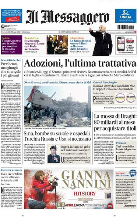 ROMA – Unioni civili, Siria:: questi gli argomenti principali delle prime pagine dei giornali di martedรฌ 16 febbraio. La prima pagina de La Stampa: “Unioni civili, l’accordo non c’รจ e la legge rischia. Boschi tratta e poi si arrende: avanti cosรฌ. Forza Italia: voto largo senza le adozioni”. La prima pagina del Corriere della Sera: “Unioni civili, l’intesa non c’รจ. Fallisce la trattativa nel Pd. Zanda: inevitabile la norma taglia emendamenti”. La prima pagina de La Repubblica: “Siria, strage negli ospedali. Cinque nel mirino, bombardate anche due scuole. Accuse a Mosca. Assad: colpa degli Usa”. La prima pagina del Sole 24 Ore: “Borse e bond in rialzo: sprint di banche e auto”.