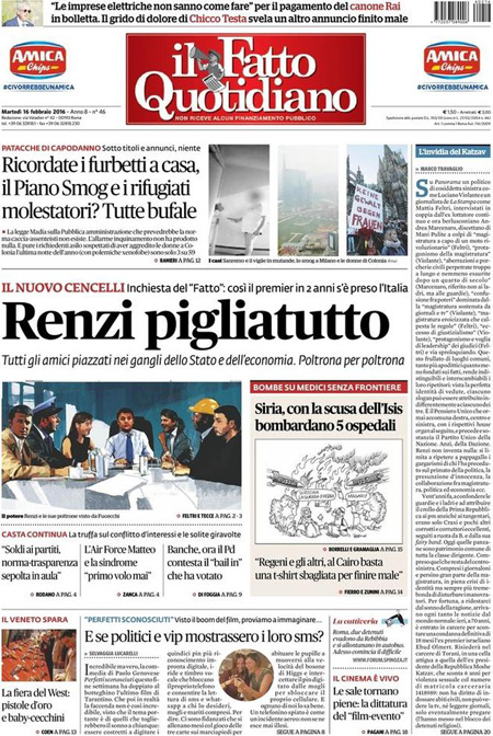 La prima pagina del Messaggero: “Adozioni, l’ultima trattativa. Unioni civili, oggi al Senato i primi voti decisivi. Nessun accordo con i cattolici del Pd”. La prima pagina del Giornale: “Ennesimo pasticcio. Canone Rai, รจ caos”. La prima pagina del Fatto Quotidiano: “Renzi pigliatutto. Tutti gli amici piazzati nei gangli dello Stato e dell’economia. Poltrona per poltrona”. La prima pagina di Libero: “Reversibilitร nel mirino. Cosรฌ tagliano le pensioni alle vedove”. Unioni civili, Siria:: questi gli argomenti principali delle prime pagine dei giornali di martedรฌ 16 febbraio. Guarda tutte le prime pagine dei giornali di martedรฌ 16 febbraio:
