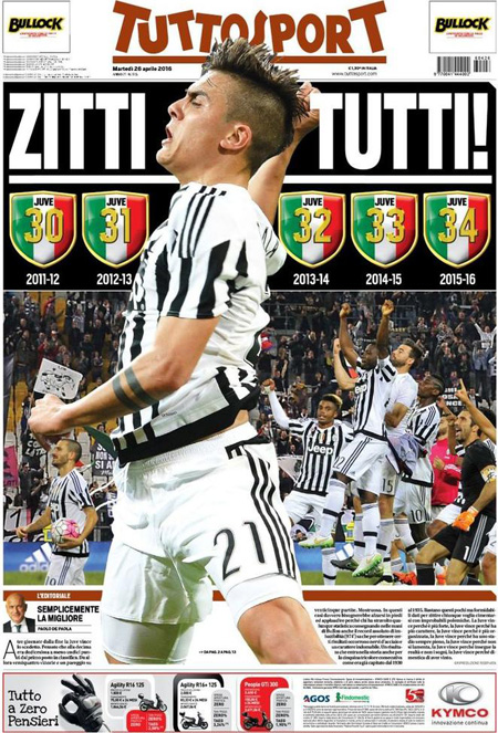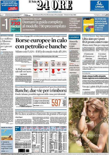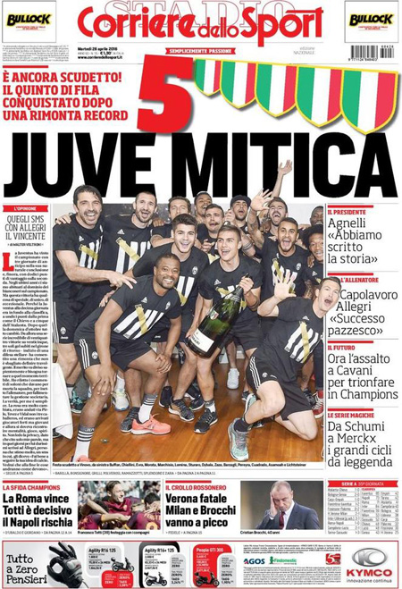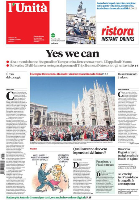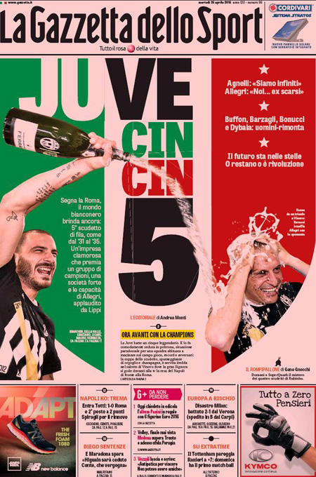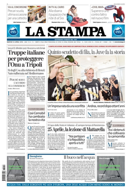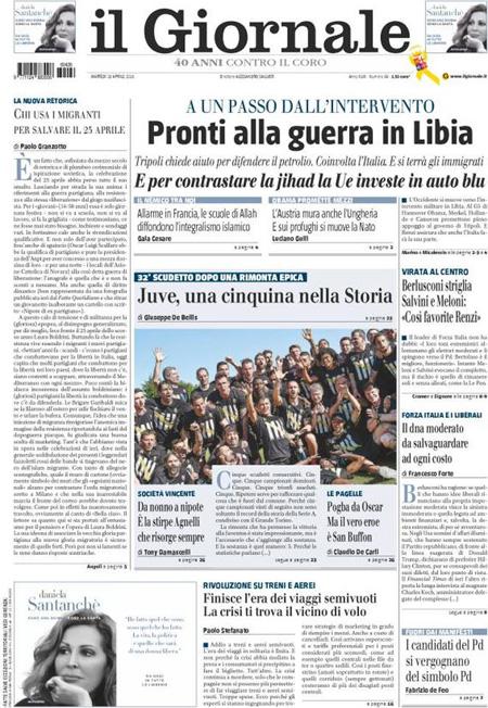 Altri giornali titolano invece sulle celebrazioni per l’anniversario della Liberazione (da posizioni molto diverse), mentre Libero apre con un’intervista al leader del Front National Marine Le Pen, e i quotidiani sportivi celebrano la vittoria dello scudetto da parte della Juventus, matematicamente prima grazie alla vittoria di ieri della Roma sul Napoli.
