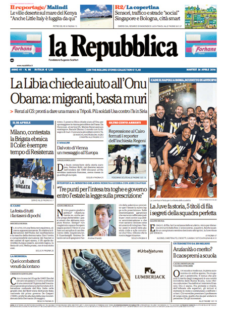 ROMA – I giornali di oggi, 26 aprile, aprono sul vertice del G5 ad Hannover, che ha affrontato la richiesta del governo libico di aiuto internazionale per contrastare l’attività dell’Isis sul suo territorio e le iniziative europee sull’accoglienza dei migranti.