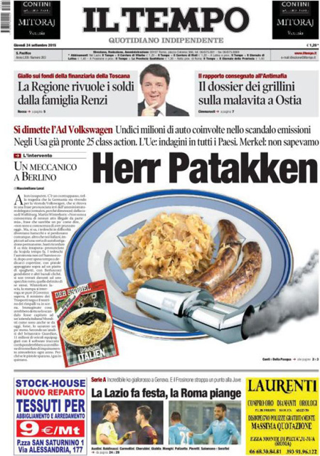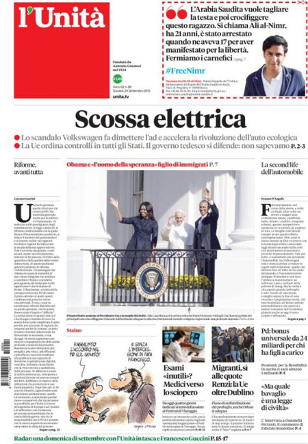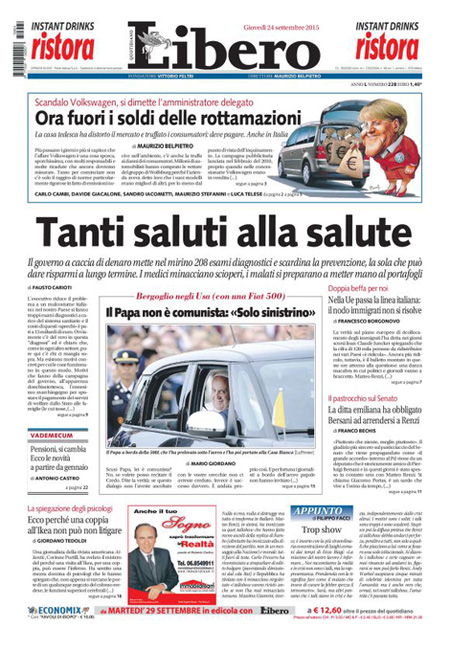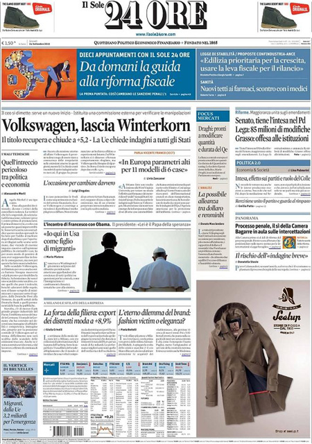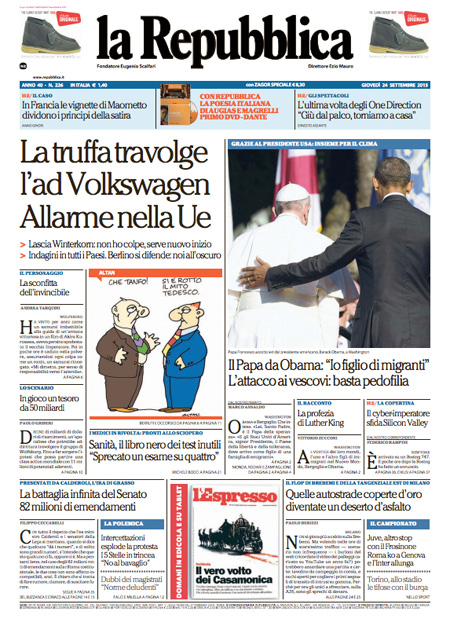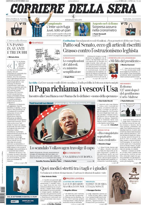ROMA – Le prime pagine di giovedì 24 settembre. La Stampa: “Volkswagen, l’ad si dimette. Inchieste in tutto il mondo”. Il Corriere della Sera: “Il Papa richiama i vescovi Usa”. La Repubblica: “La truffa travolge l’ad Volkswagen. Allarme nella Ue”.