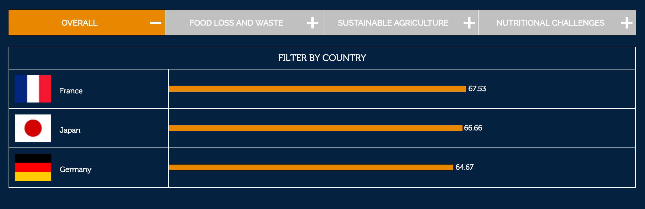 Tra i 25 Paesi analizzati, rappresentanti oltre i due terzi della popolazione mondiale e l’87 per cento del Pil globale, la Francia guadagna il primo posto soprattutto per le sue innovative politiche contro lo spreco e per l’approccio equilibrato all’alimentazione. Giappone e Canada si collocano al secondo e terzo posto grazie alle loro politiche in tema di agricoltura sostenibile e nella diffusione di regimi alimentari corretti ed equilibrati. In fondo alla classifica ci sono India, Arabia Saudita ed Egitto, che si trovano ad affrontare la doppia sfida dell’obesità e della malnutrizione.