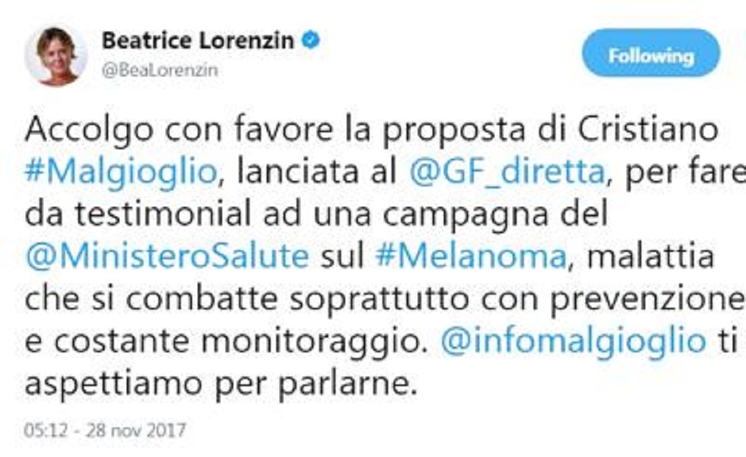 Dopo l’eliminazione Malgioglio aveva poi ricordato l’importanza della prevenzione e si era offerto come testimonial. “Voglio dire ai giovani che fare la mappatura è importante”. E Lorenzin ha colto l’invito e ha pubblicato la sua decisione via Twitter: “Accolgo con favore la proposta di Cristiano #Malgioglio, lanciata al @GF_diretta, per fare da testimonial ad una campagna del @MinisteroSalute sul #Melanoma, malattia che si combatte soprattutto con prevenzione e costante monitoraggio. @infomalgioglio ti aspettiamo per parlarne”.