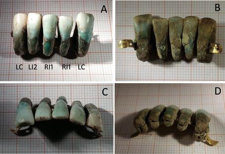 “La lamina fuoriesce ai due lati della protesi con due alette piegate ad S, sulle quali sono presenti due piccoli fori che garantivano l’ancoraggio ai denti ancora in situ nella mandibola, di cui non è però stata trovata traccia. Infatti, i tentativi di associazione con le numerose mandibole rinvenute nella tomba collettiva che raccoglieva i resti di quasi un centinaio di individui, sepolti assieme alla protesi, non hanno dato esito positivo. In ogni caso, la presenza di un deposito di tartaro sulla superficie dei denti dimostra che l’apparecchio fu portato a lungo”.