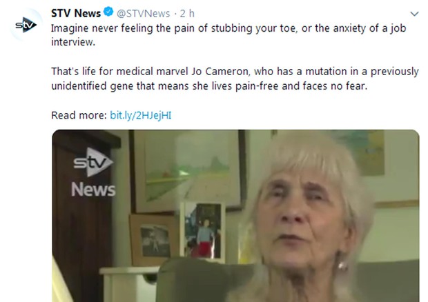 Jo non ha sentito dolore neppure durante il parto: “Era strano ma non avvertivo dolore. Anzi in realtà era divertente”. I genetisti hanno scoperto nel suo Dna due mutazioni in due geni limitrofi FAAH-OUT e FAAH, quest’ultimo già noto per avere un ruolo nella sensibilità al dolore, nell’umore e nella memoria. Non a caso la donna risulta del tutto priva di ansia, sempre felice e molto smemorata.