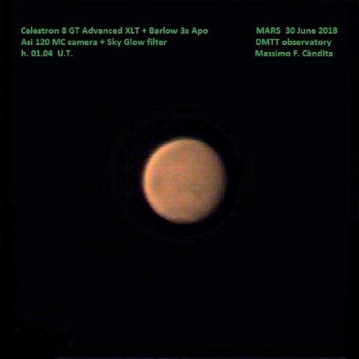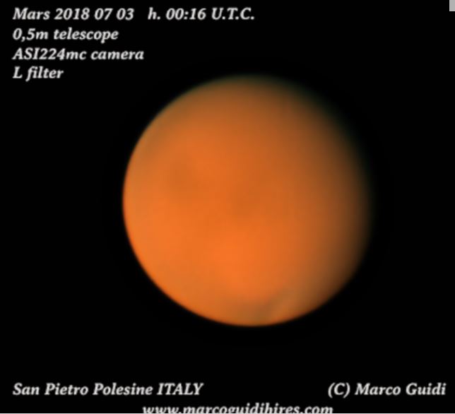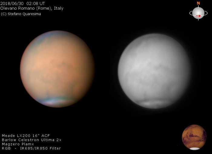 Marte ripreso in luce visibile e nell'infrarosso. Nonostante la tempesta du sabbia sono visibili le ombre delle formazioni marziane (fonte: Tommaso Massimo Stella, Taranto)