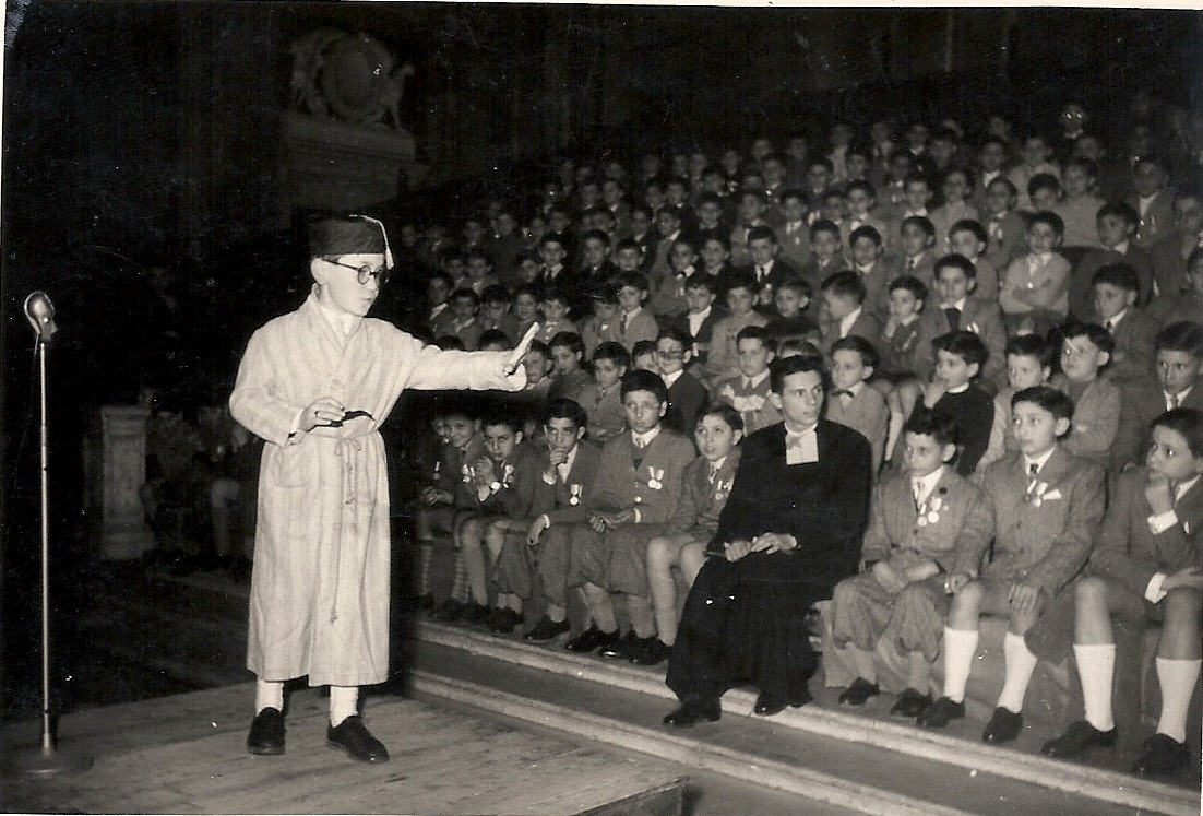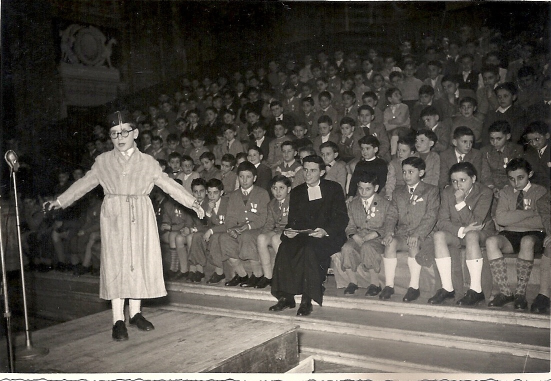 Da uno scatolone in soffitta esce un vecchio disco in vinile, 78 giri; da un album di foto in bianco e nero emergono le immagini di un bambino su un palchetto rialzato. Indossa una vestaglia, porta gli occhiali, in testa ha una specie di fez, dietro sono seduti, su una gradinata di panche, tanti bambini con i loro vestiti migliori. La foto è di 60 anni fa, i jeans non erano ancora sbarcati, non ci ci vestiva scaciati senza rispetto umano, i bambini portavano calzoni corti e calzettoni anche d’inverno, fino alla scuola media.