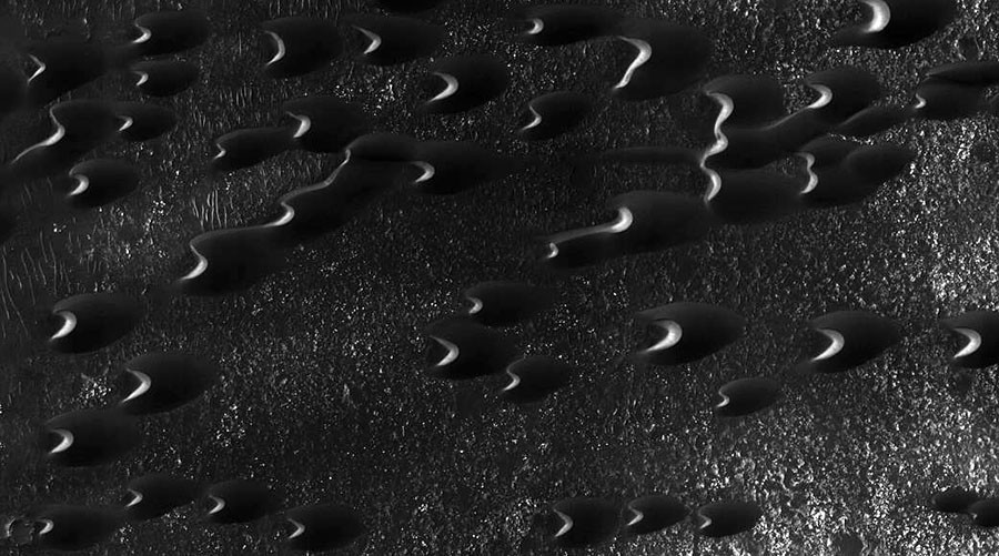 Nel video si vedono le dune nella regione di Hellespointus, alternate a profondi crateri, proprio come accade per i paesaggi desertici del pianeta Terra o per le dune in Arabia. Le dune prendono così la forma di un verme, probabilmente per l’azione della luce del sole, come ha spiegato la Nasa al Daily Mail.Â