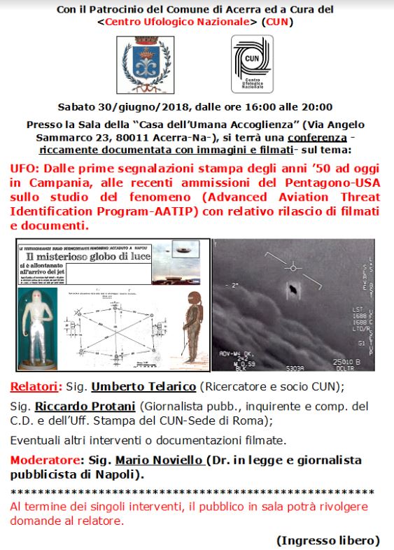 ROMA – Sabato 30 giugno 2018, nella sala multimediale della Casa dell’Umana Accoglienza (Via Angelo Sammarco 23, Acerra, Napoli), dalle 16:00 alle ore 20:00, si terrà una conferenza sugli UFO. Tema dell’incontro: dalle prime segnalazioni stampa degli anni ’50 ad oggi sulla Campania, alle recenti ammissioni del Pentagono-USA sul programma di studio degli UFO (Advanced Aviation Threat Identification Program-AATIP) con relativo rilascio di filmati e documenti”. [App di Blitzquotidiano, gratis, clicca qui,- Ladyblitz clicca qui –Cronaca Oggi, App on Google Play]