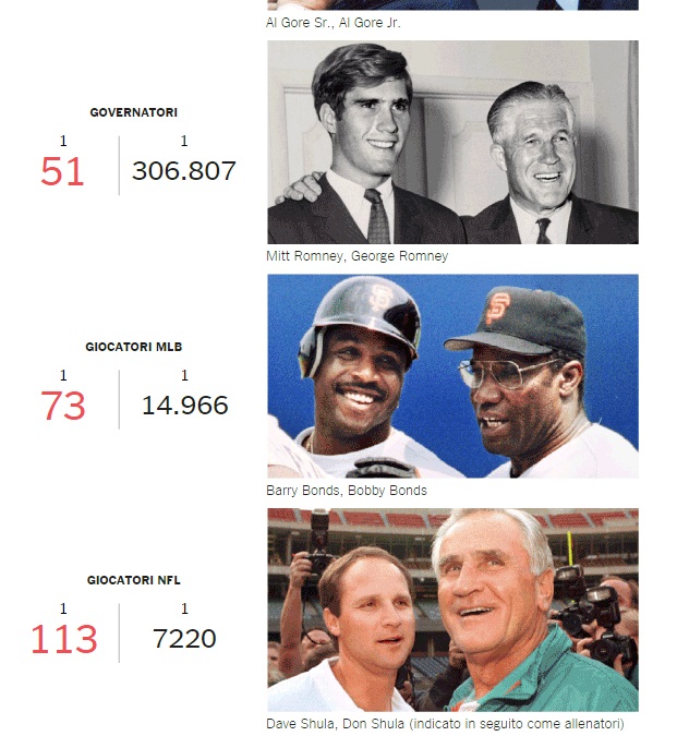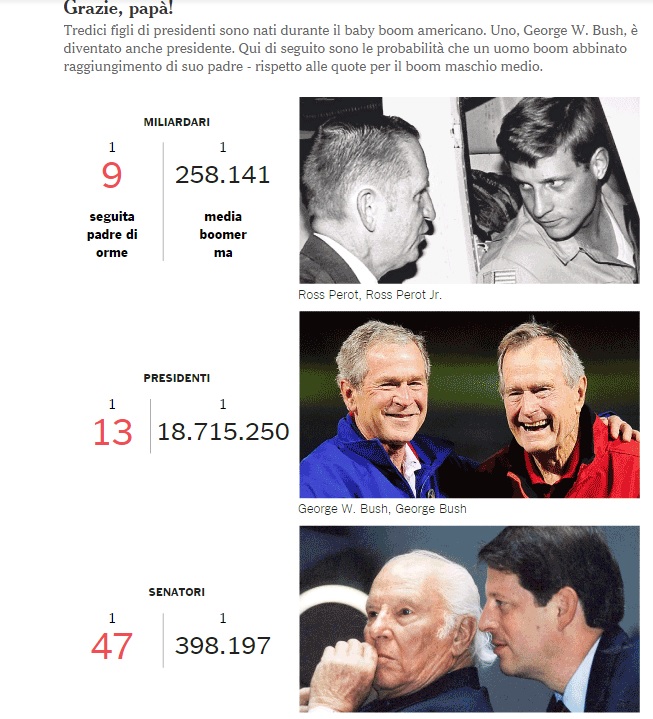 Davidowits non si ferma qui. Un figlio di senatore su 47 è senatore, mentre solo un babyboomer su 398.197 riesce a diventare senatore: un “figlio di” ha 8.500 chance in più rispetto agli altri. Un figlio di governatore su 51 è governatore: 6.000 probabilità in più di un americano medio. Su 9 miliardari, uno è figlio di miliardario, mentre solo un baby boomer su 258.141 riesce a diventarlo. Secondo i calcoli di Davidowitz, hai 28.000 probabilità in più di diventare miliardario se tuo padre lo è già.