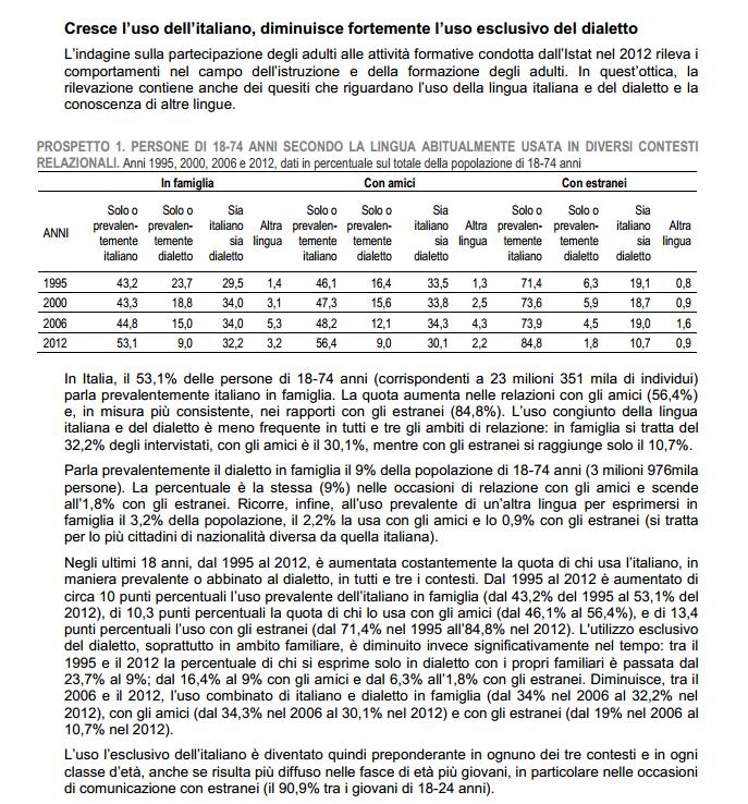 Più della metà degli italiani, il 53,2%, parla soltanto o in prevalenza in italiano quando è in famiglia. Nel 1995 era il 43,2%. Una percentuale che sale al 56,4% quando si è in compagnia degli amici e ad un ancora più netto 84,8% quando si ha a che fare con persone estranee: è questo il risultato del rapporto Istat – anno 2012 – sull’uso della lingua italiana, dei dialetti e delle altre lingue nel nostro Paese.