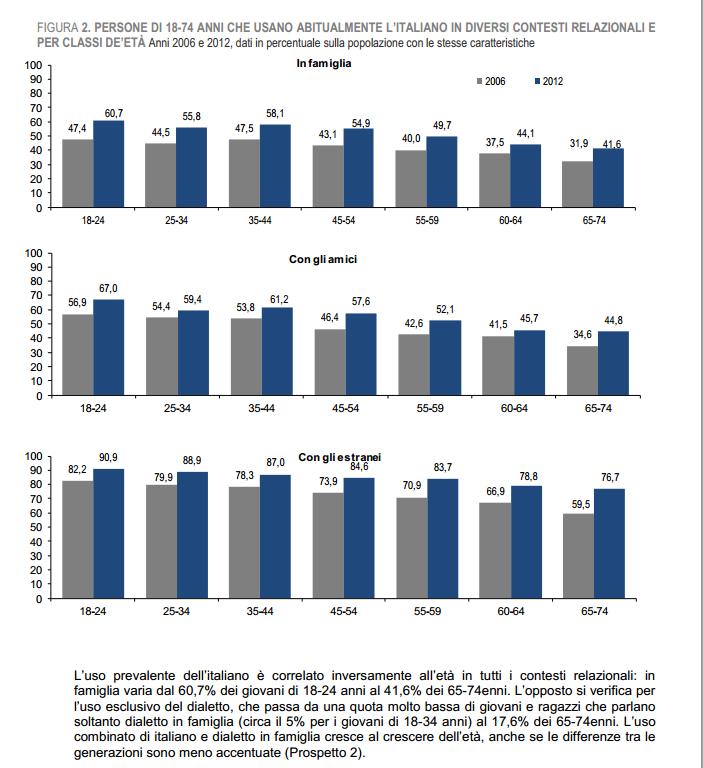 ETÀ. I giovani parlano sempre di più italiano, il dialetto è più diffuso fra gli anziani: l’uso prevalente dell’italiano decresce con l’aumentare dell’età a favore dell’uso esclusivo e combinato al dialetto. Per esempio, in famiglia a parlare più spesso italiano sono il 60,7% dei giovani di 18-24 anni contro il 41,6% dei 65-74enni.