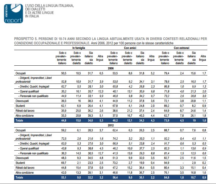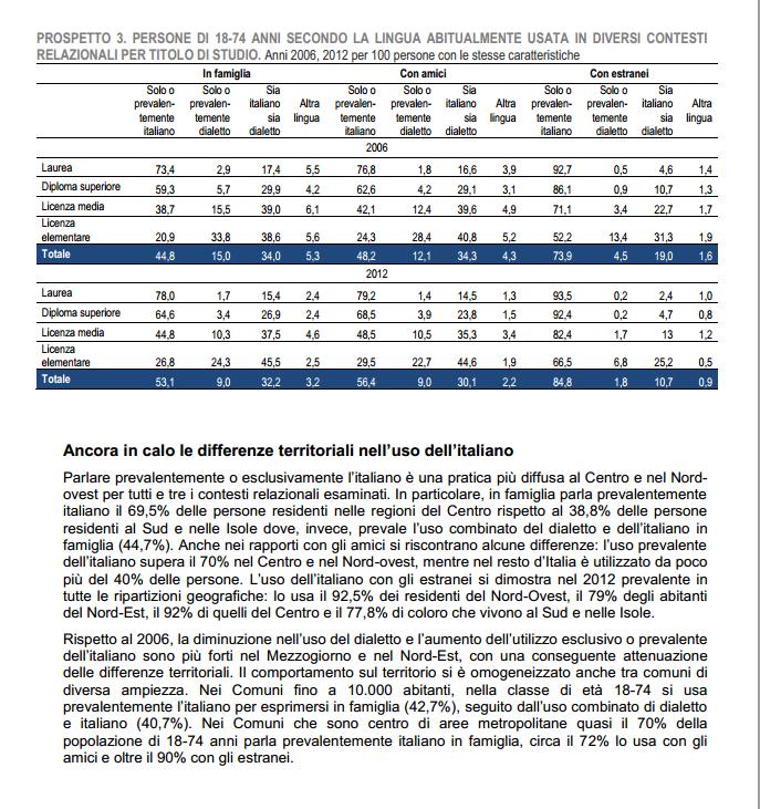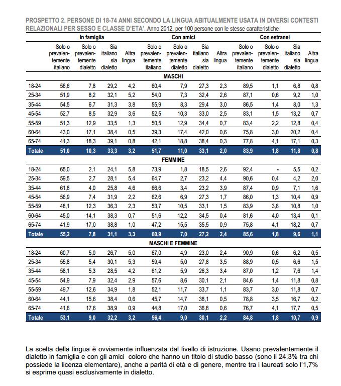 Ad usare il dialetto come prima lingua in famiglia sono 3 milioni 976 mila persone, cioè il 9% degli italiani fra i 18 e i 74 anni. Stessa percentuale di italiani parla in prevalenza dialetto con gli amici. Solo l’1,8% parla dialetto con gli estranei. Nel 1995 a parlare dialetto in famiglia era il 23,7%, con gli amici il 16,4%, con gli estranei il 6,3%.