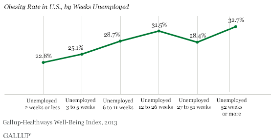 La percentuale di obesi fra chi ha perso il lavoro da due settimane è del 22,8%. Percentuale che aumenta fino al 32,7% fra i disoccupati da 52 settimane (ovvero un anno).