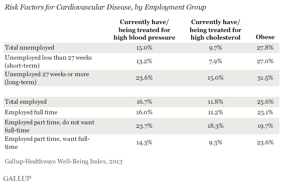 Ancora più netta è la differenza fra i disoccupati a lungo termine (più di 27 settimane) e quelli a breve termine (meno di 27 settimane) per quanto riguarda i problemi di colesterolo e pressione alta: a soffrirne fra i disoccupati da più di 27 settimane è il doppio rispetto a chi ha perso il lavoro da meno tempo.