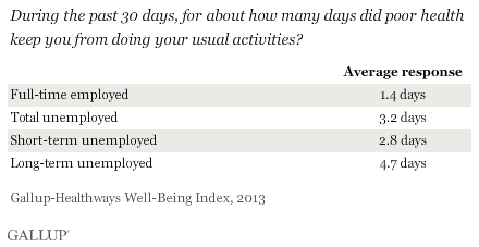 Chi lavora di più, invece, sta meglio, quanto a salute. Alla domanda “Quanti giorni al mese le cattive condizioni di salute ti impediscono di svolgere le tue attività quotidiane”, chi è impiegato a tempo pieno ha risposto 1,4 giorni su 30. Chi ha perso il lavoro da poco tempo ha risposto 2,8 giorni. Chi è disoccupato da più di 27 settimane ha risposto 4,8 giorni.