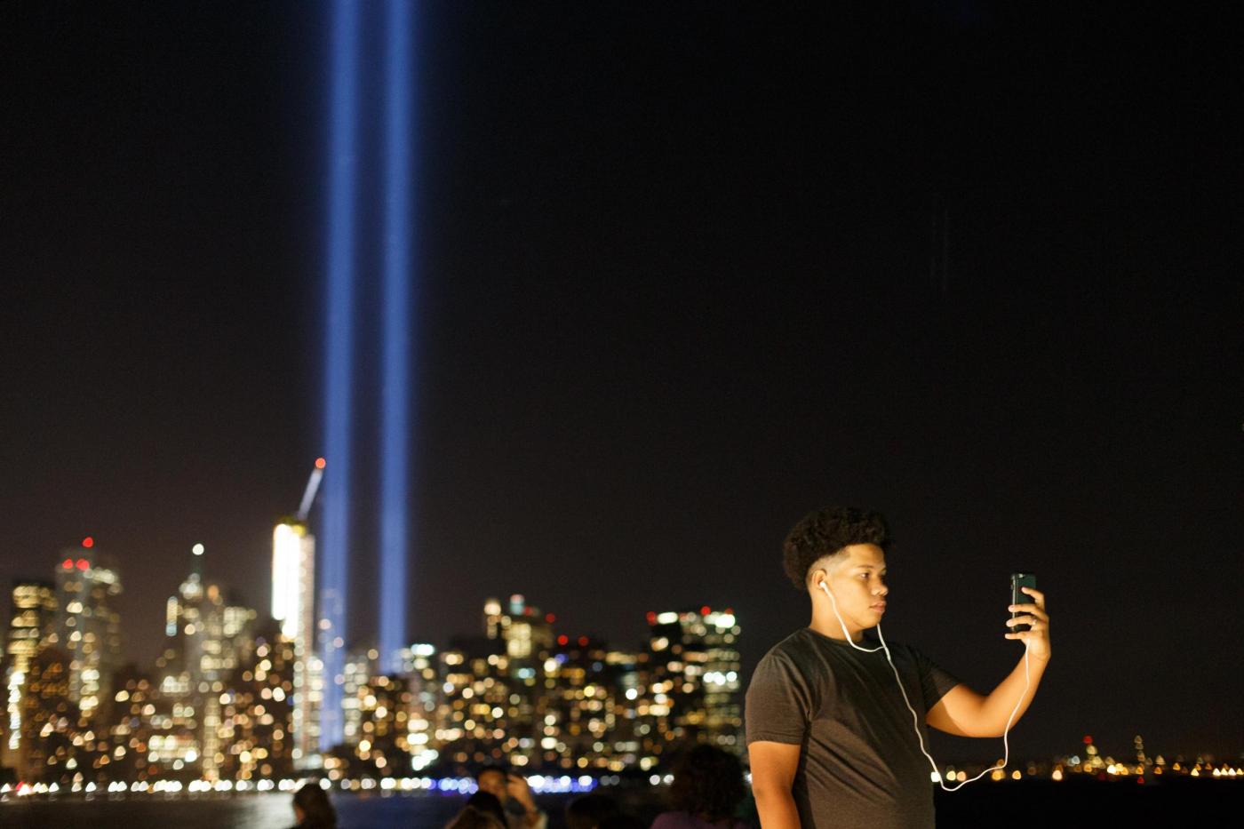 NEW JERSEY, Sept. 12, 2015 (Xinhua) — A young man takes a selfie with the Tribute in Light from Jersey City, New Jersey, the United States of America, Sept. 11, 2015. It was the 14th anniversary of the Sept. 11 terror attacks on Friday. (Xinhua/Li Muzi) (zjy)