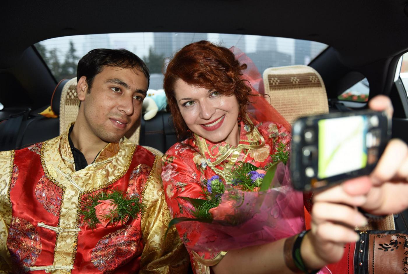 HANGZHOU, Oct. 6, 2015 (Xinhua) — A couple take selfie during an international group wedding ceremony at the West Lake in Hangzhou, capital of east China’s Zhejiang Province, Oct. 6, 2015. More than 100 couples from over 20 countries and regions took part in the group wedding of Chinese traditional style in Hangzhou on Tuesday. (Xinhua/Long Wei) (wf)