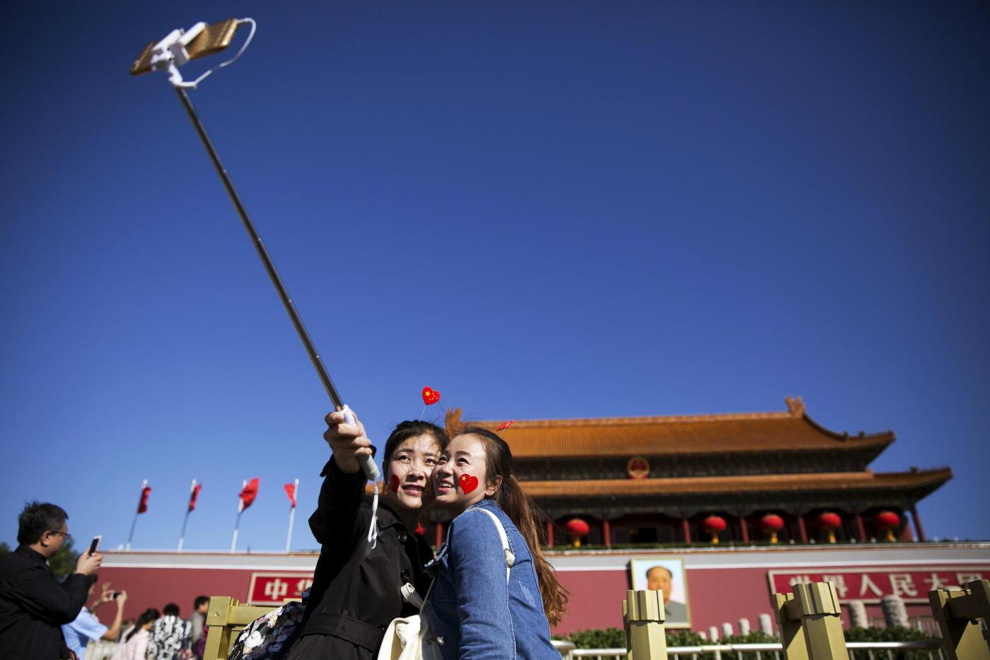 Girls take a selfie at the Tiananmen Gate as they celebrate National Day marking the 66th anniversary of the founding of the People’s Republic of China in Beijing October 1, 2015. REUTERS/Damir Sagolj