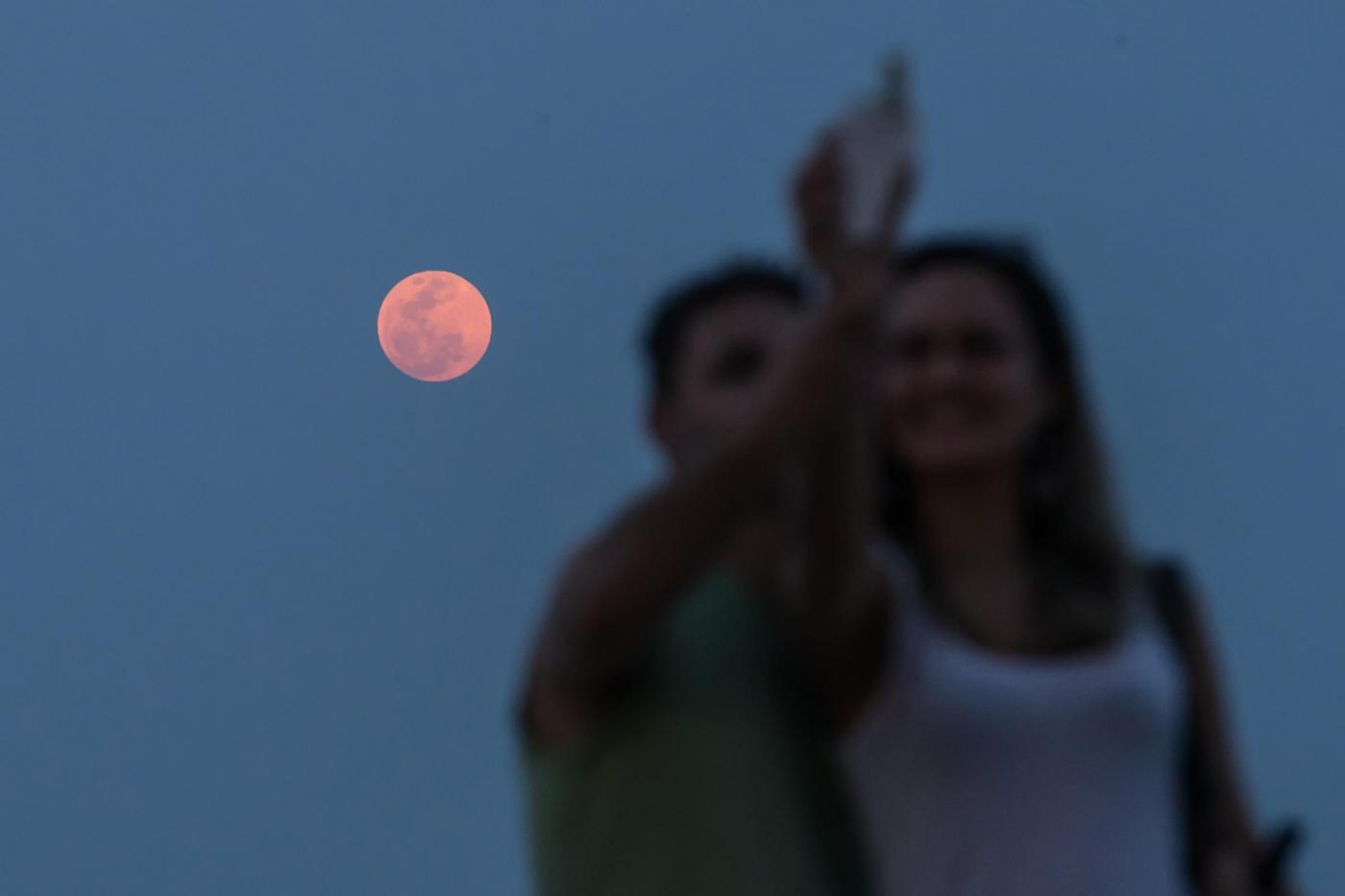 RIO DE JANEIRO, Sept. 28, 2015 (Xinhua) — Tourists take selfie photo with the "super moon" on the Arpoador Rock near the Copacabana Beach in Rio de Janeiro, Brazil, Sept. 27, 2015. (Xinhua/Xu Zijian) (cl)