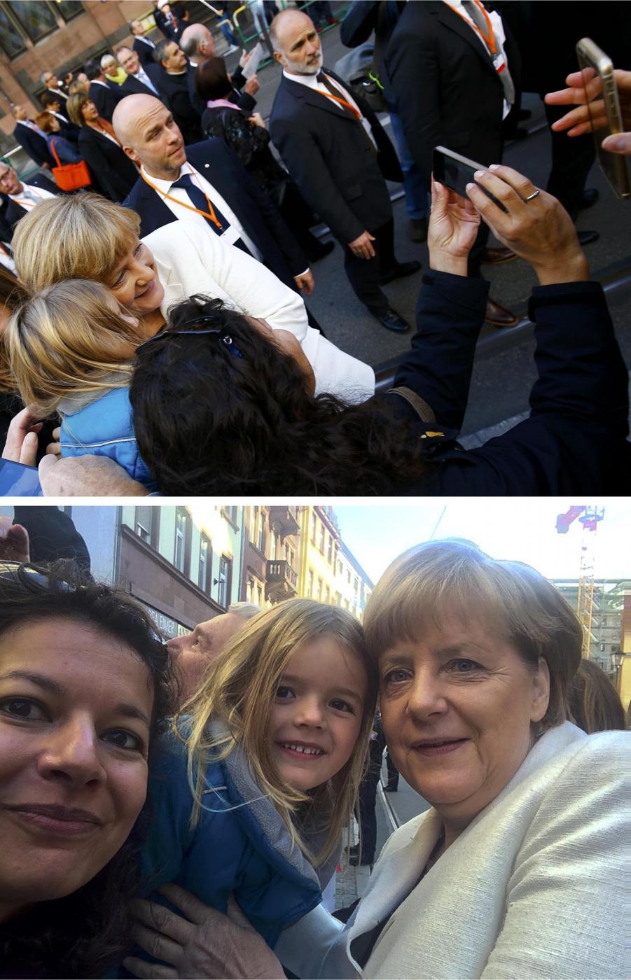 A combination of pictures shows German Chancellor Angela Merkel as she poses for a selfie with Salome Roessler and her daughter Marie in Frankfurt, Germany, October 3, 2015. Germany’s political leaders celebrate the country’s 25th anniversary since the reunification of East and West Germany. REUTERS/Kai Pfaffenbach 9top) and REUTERS/Salome Roessler
